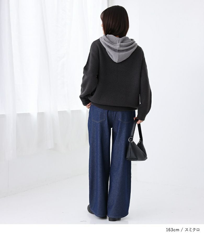 配色のフードがアクセントになったニットパーカー。レイヤードしているような襟元のデザインがこなれた印象に。落ち着いた色使いが、大人のカジュアルスタイルにお洒落感をプラスします。
