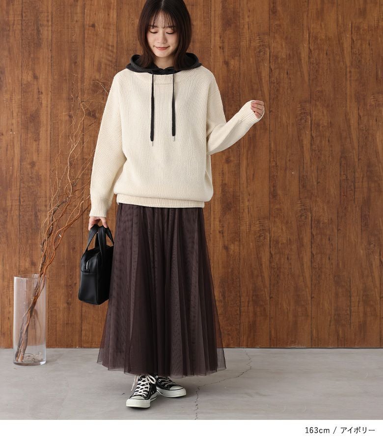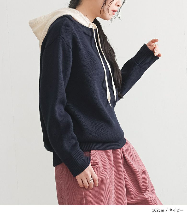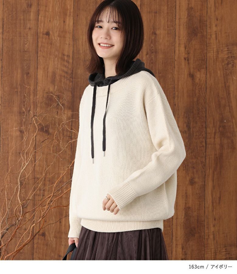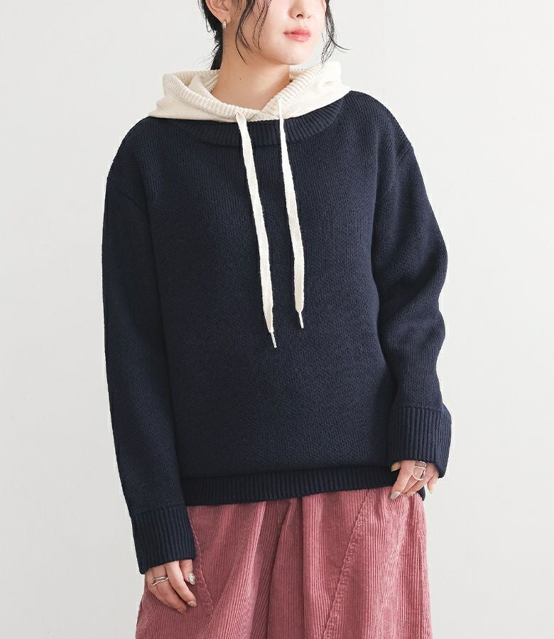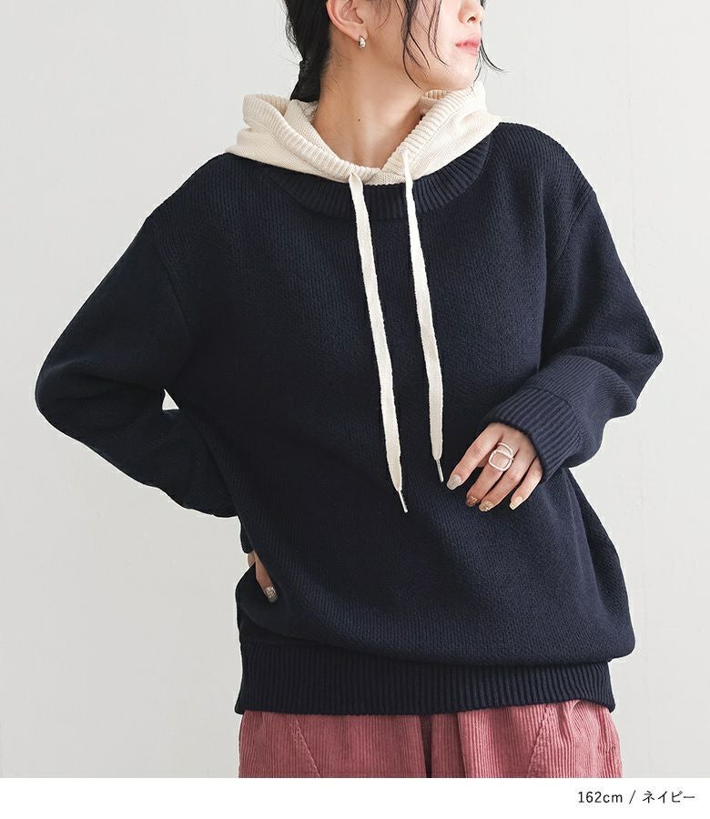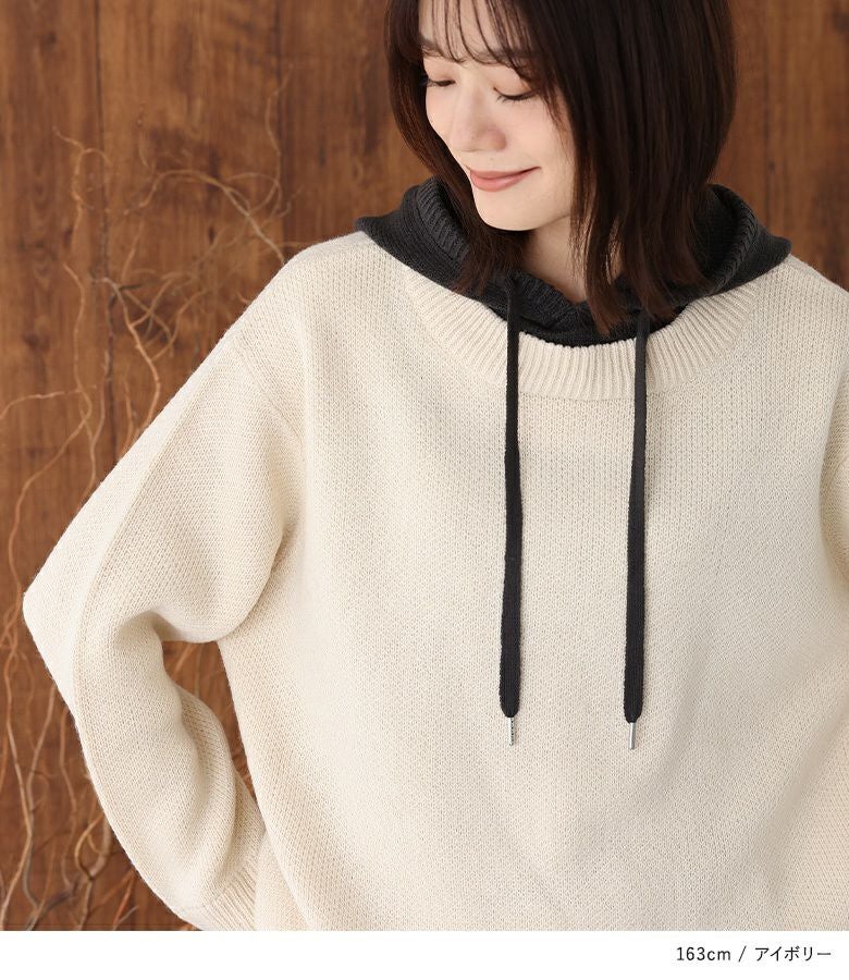 配色のフードがアクセントになったニットパーカー。