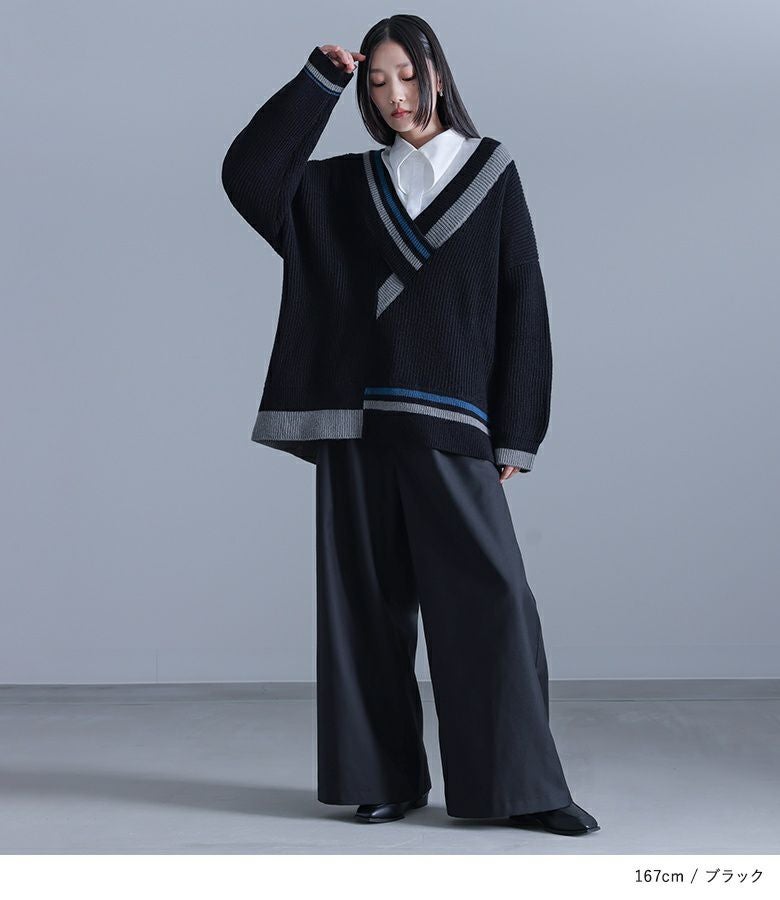 アシンメトリーに重なったVネックが個性的なニット。