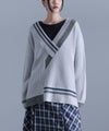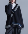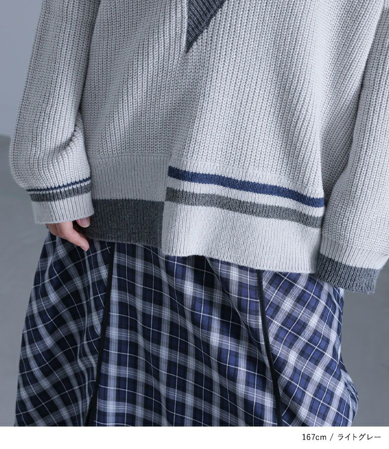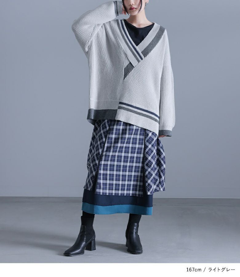 アシンメトリーに重なったVネックが個性的なニット。配色のラインもアシンメトリーにデザインし、ひとクセのある一枚に仕上げました。ゆるっと着やすいチュニック丈と、インナーをレイヤードしやすい深めのVネックで、肌寒い時期の着回しの幅が広がります。