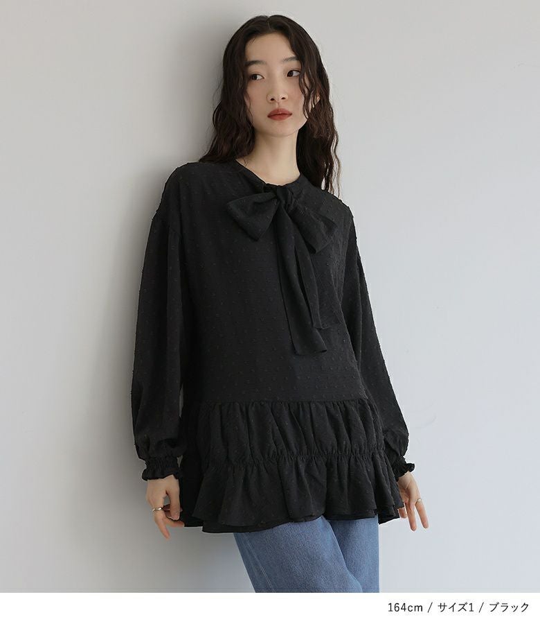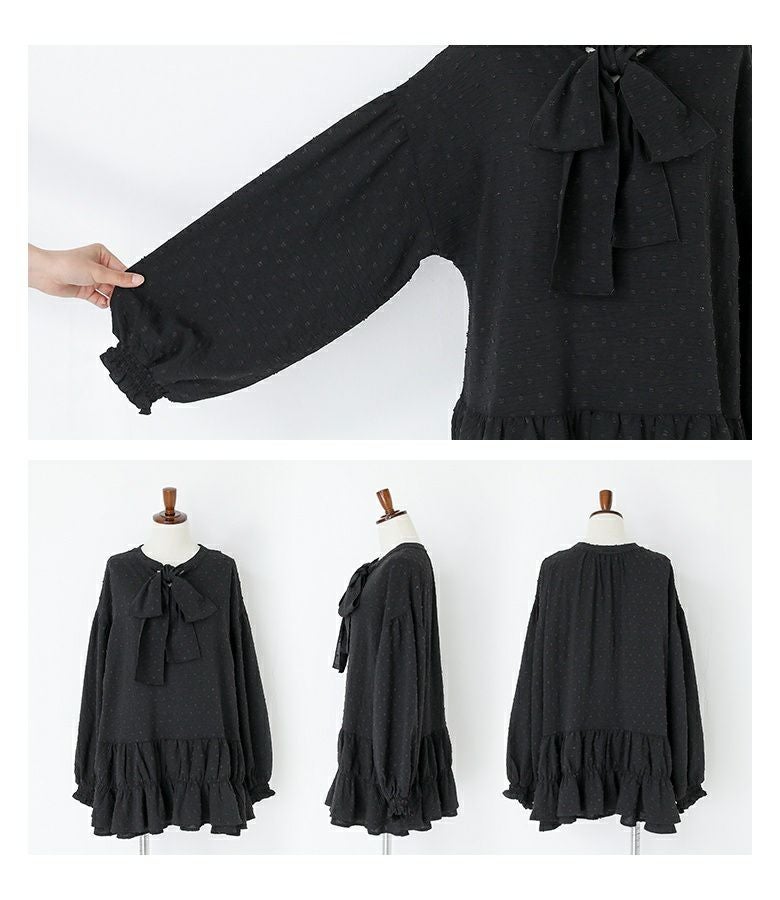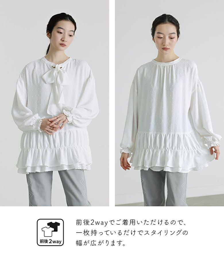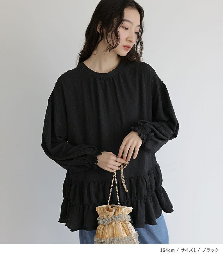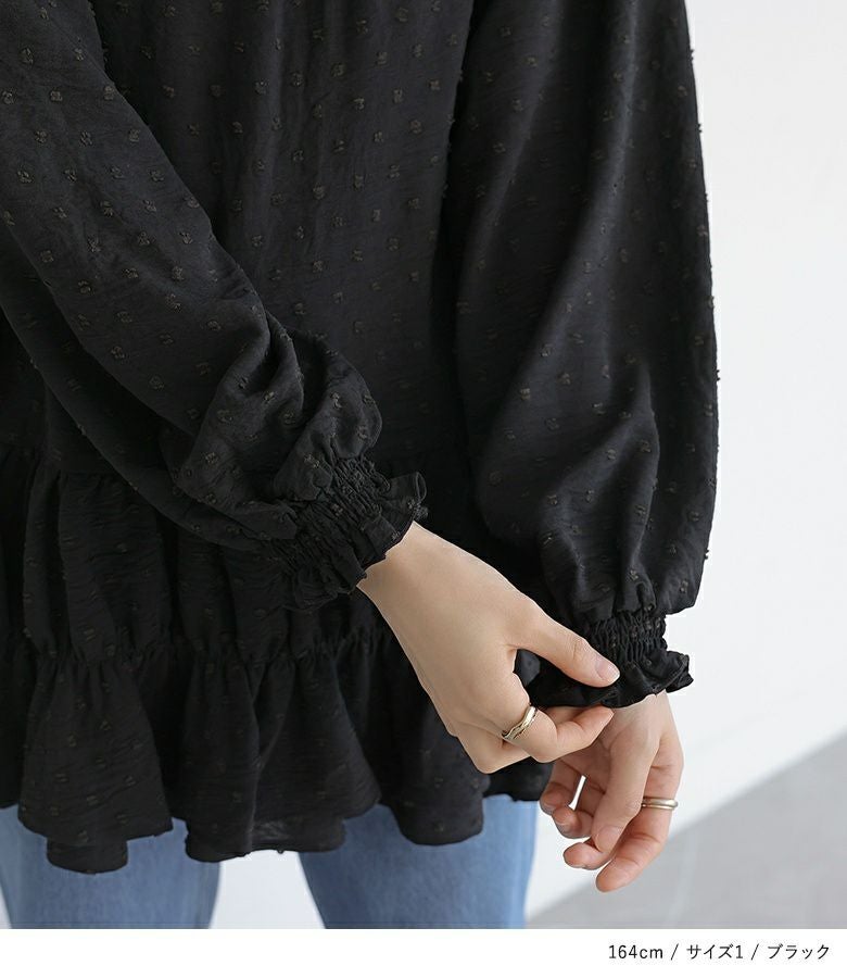 袖と裾のフリルが可愛く、着丈が長めなので体型カバーもできそうです。