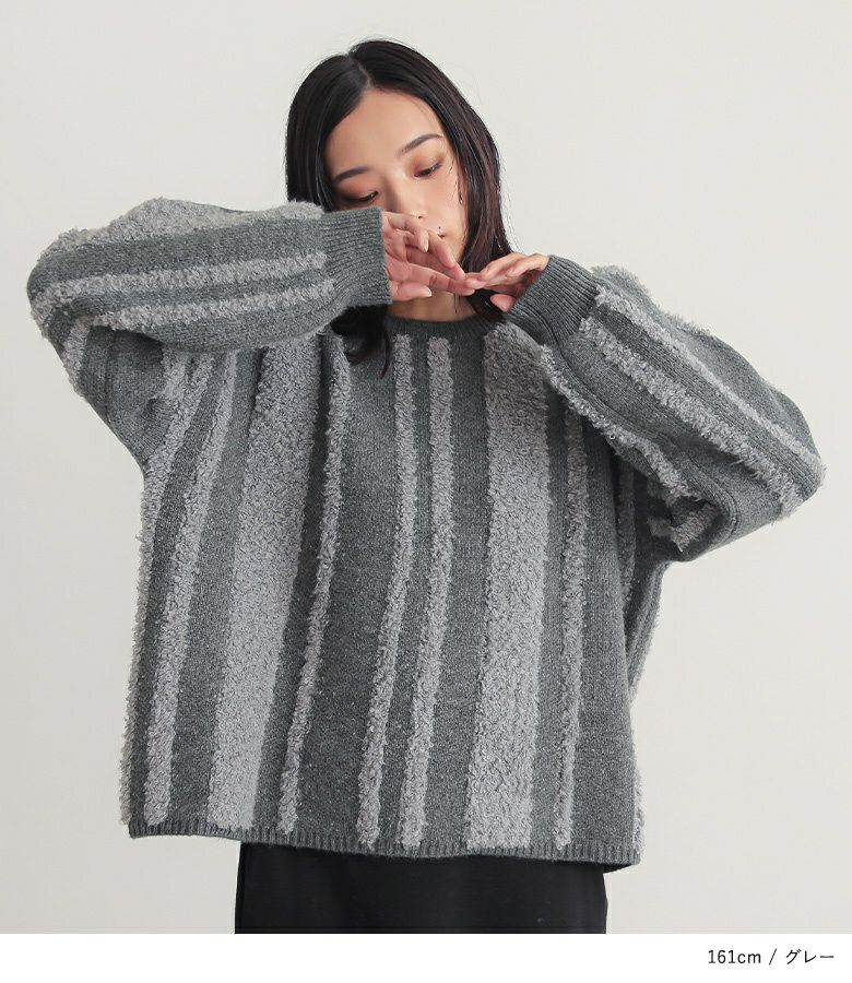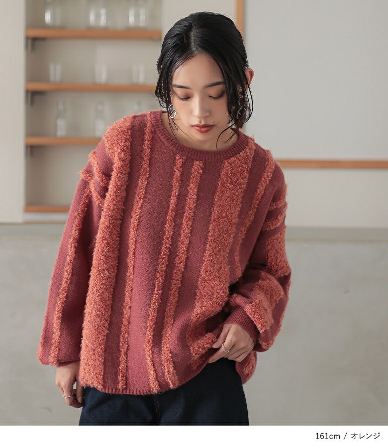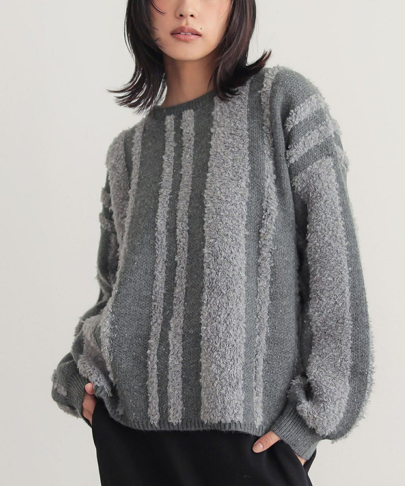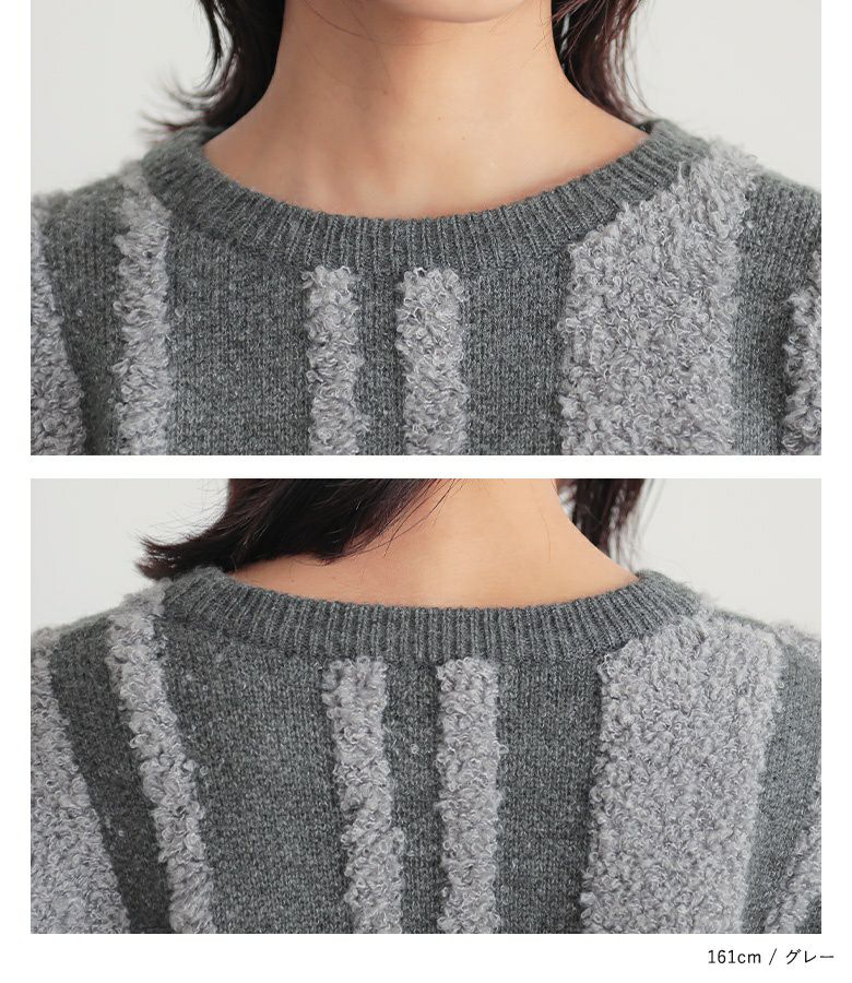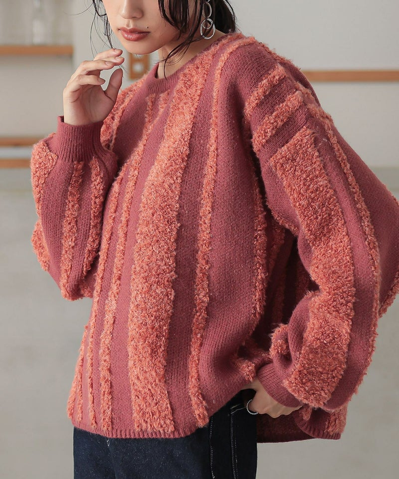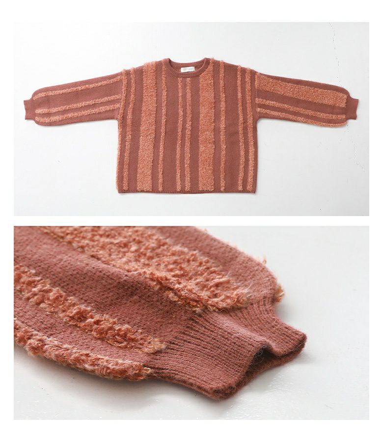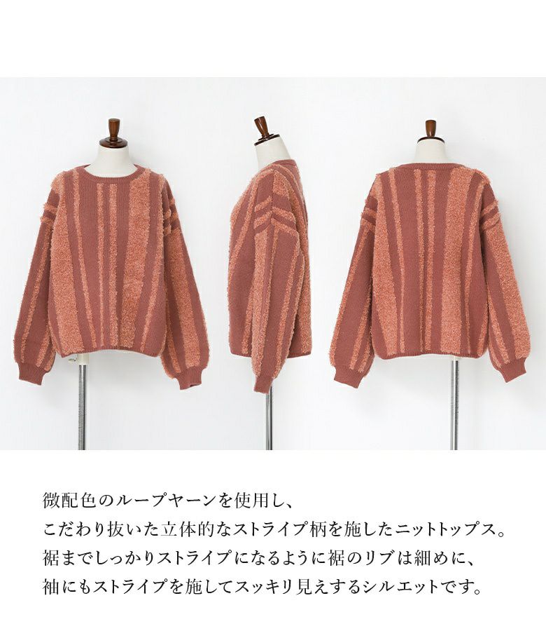 微配色のループヤーンを使用し、立体的なストライプ柄を施したニットトップス。