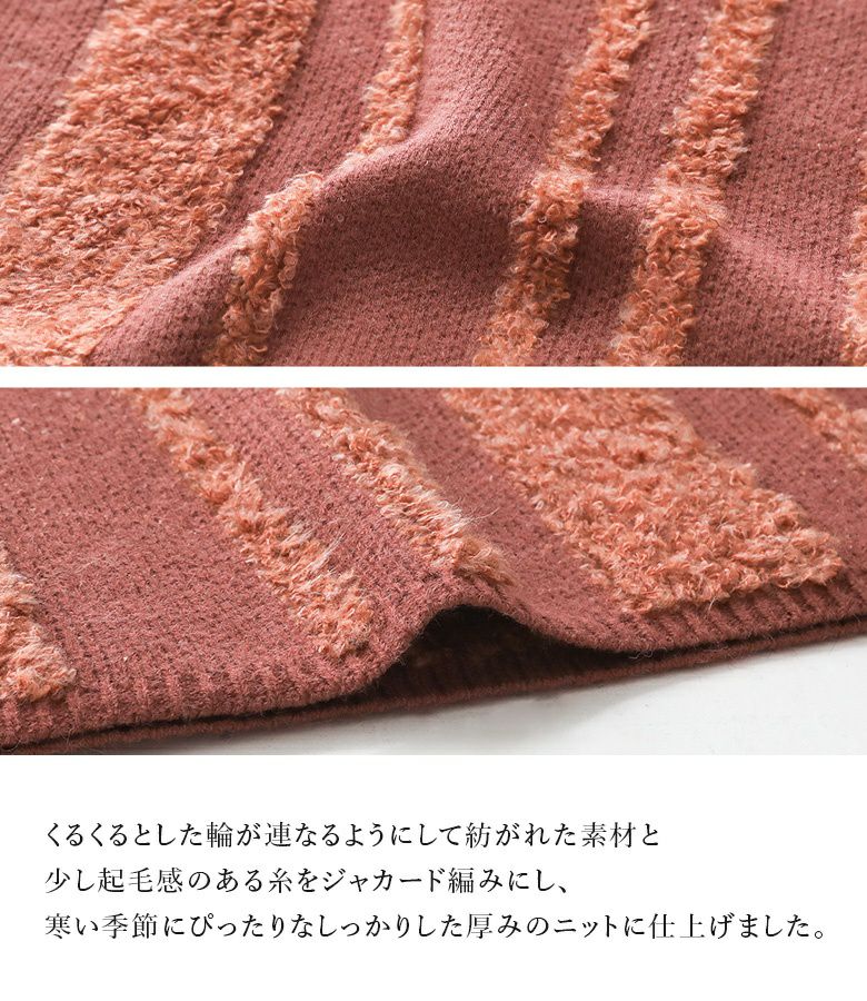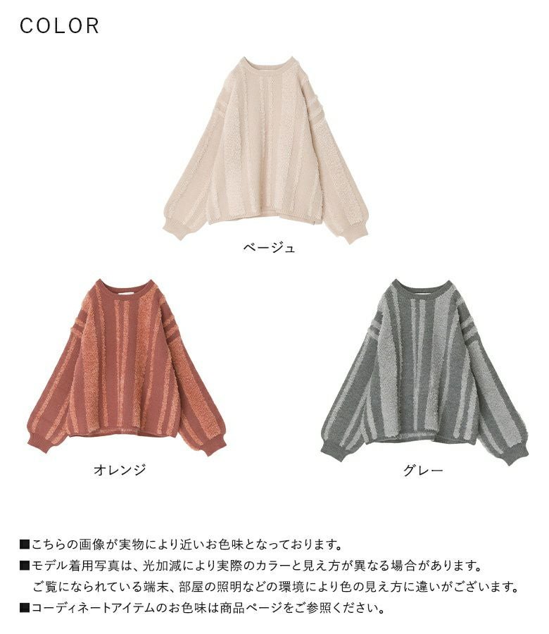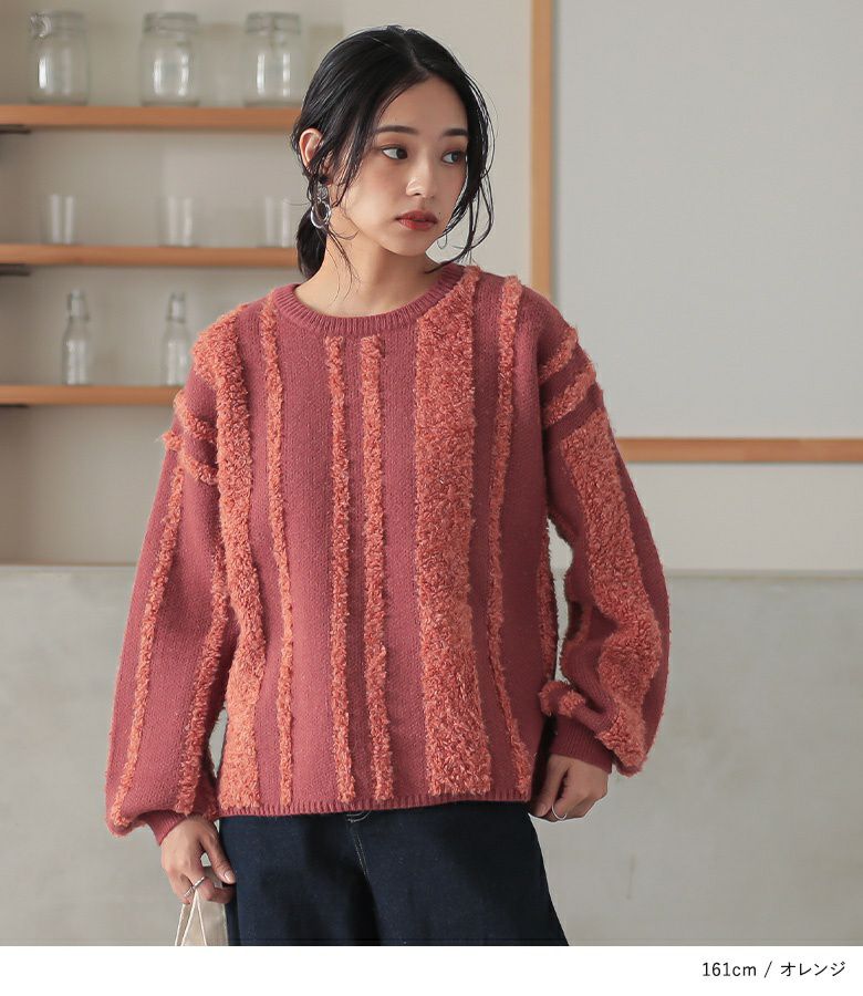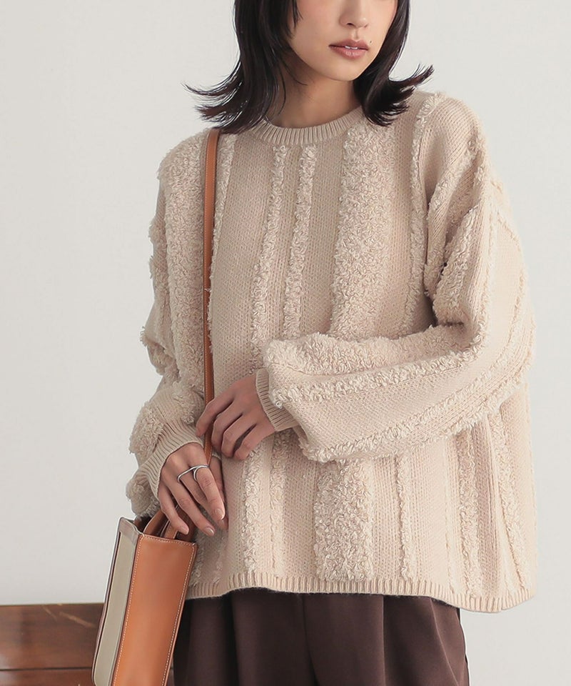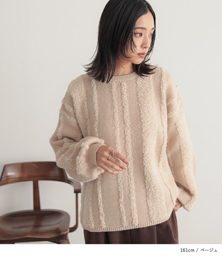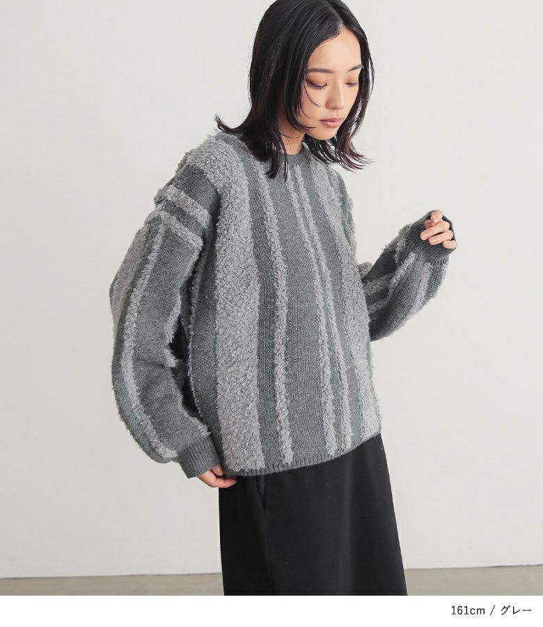 微配色のループヤーンを使用し、立体的なストライプ柄を施したニットトップス。