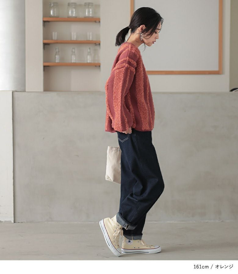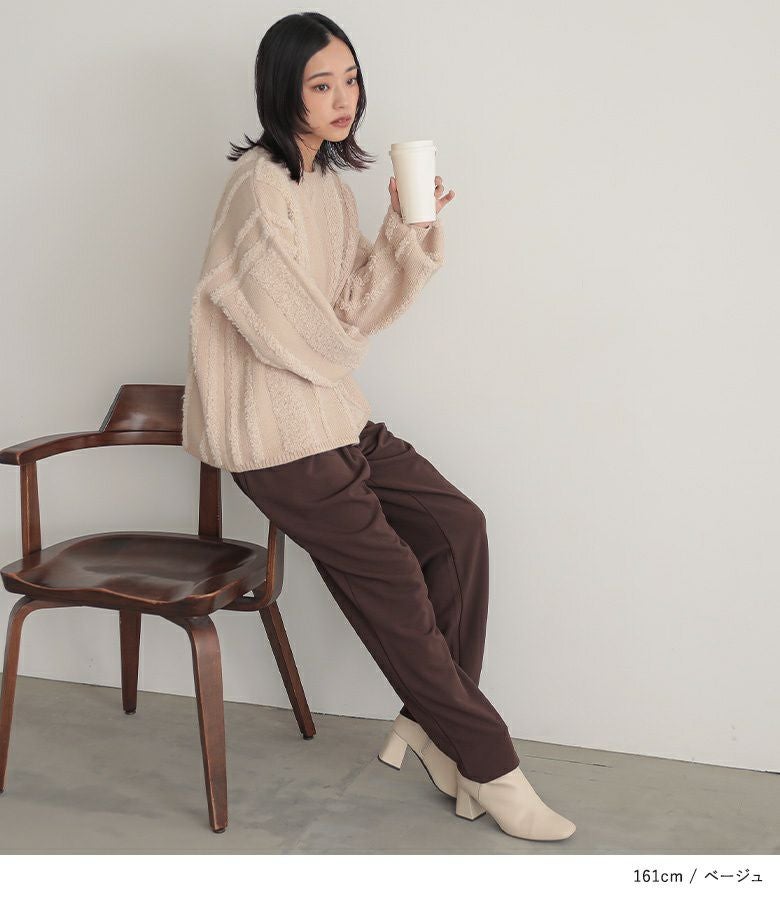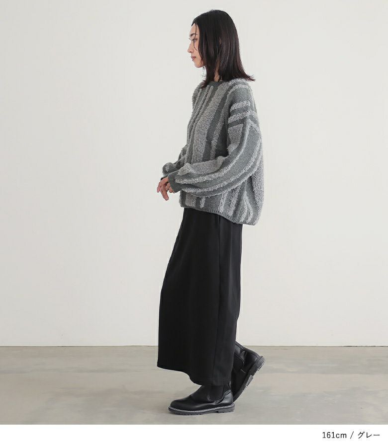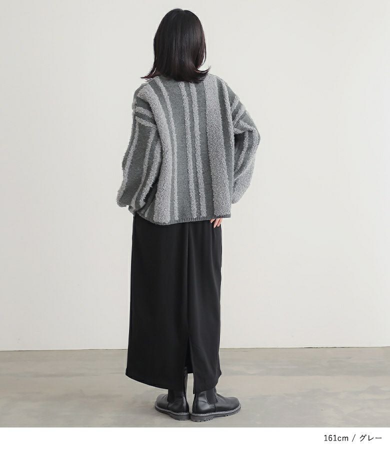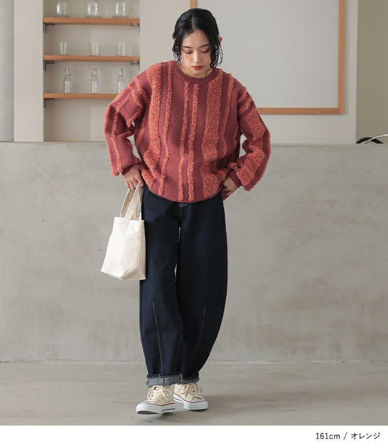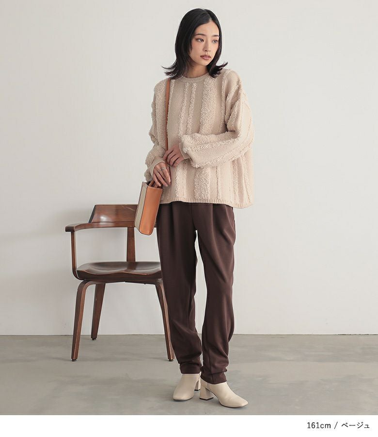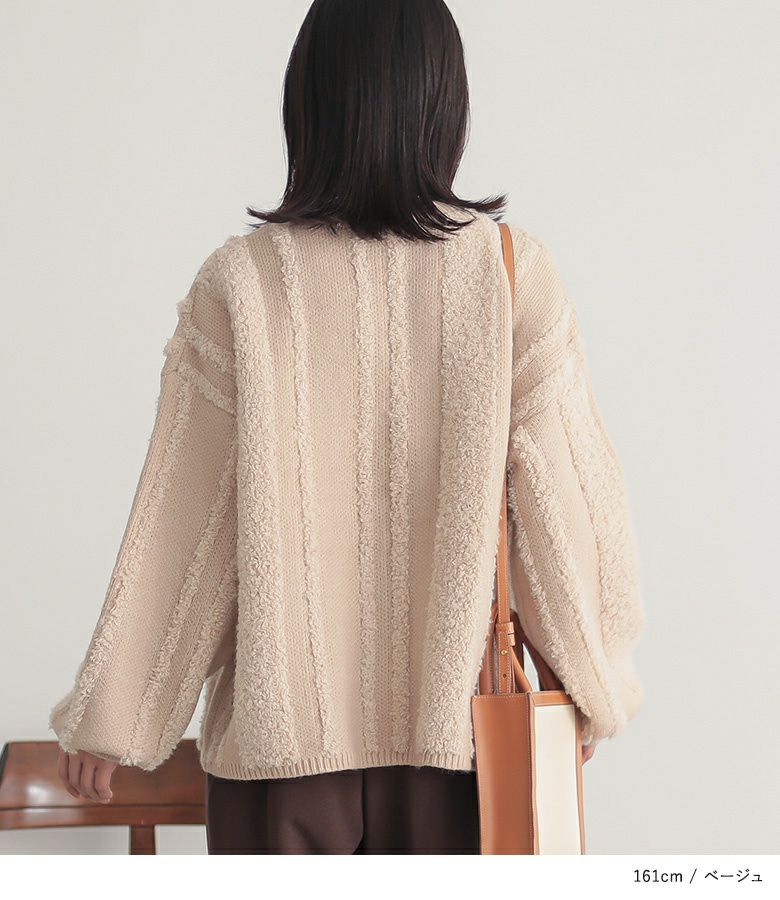 微配色のループヤーンを使用し、立体的なストライプ柄を施したニットトップス。