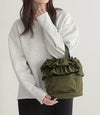 フリルの甘さとカジュアルな印象とのバランスが絶妙な巾着型のショルダーバッグ。