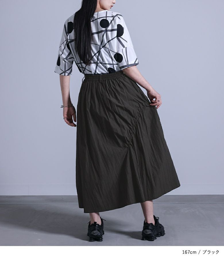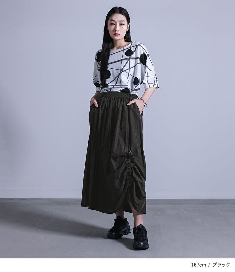 裾のドロストでアシンメトリーにシルエットを変化させられる、モードかつスポーティな印象のスカート。斜めにシャーリング切り替えを入れてバランスをとり、ベルト通しもアシンメトリーに配置したこだわりのデザインです。両サイドポケット付きなのも嬉しいポイント。