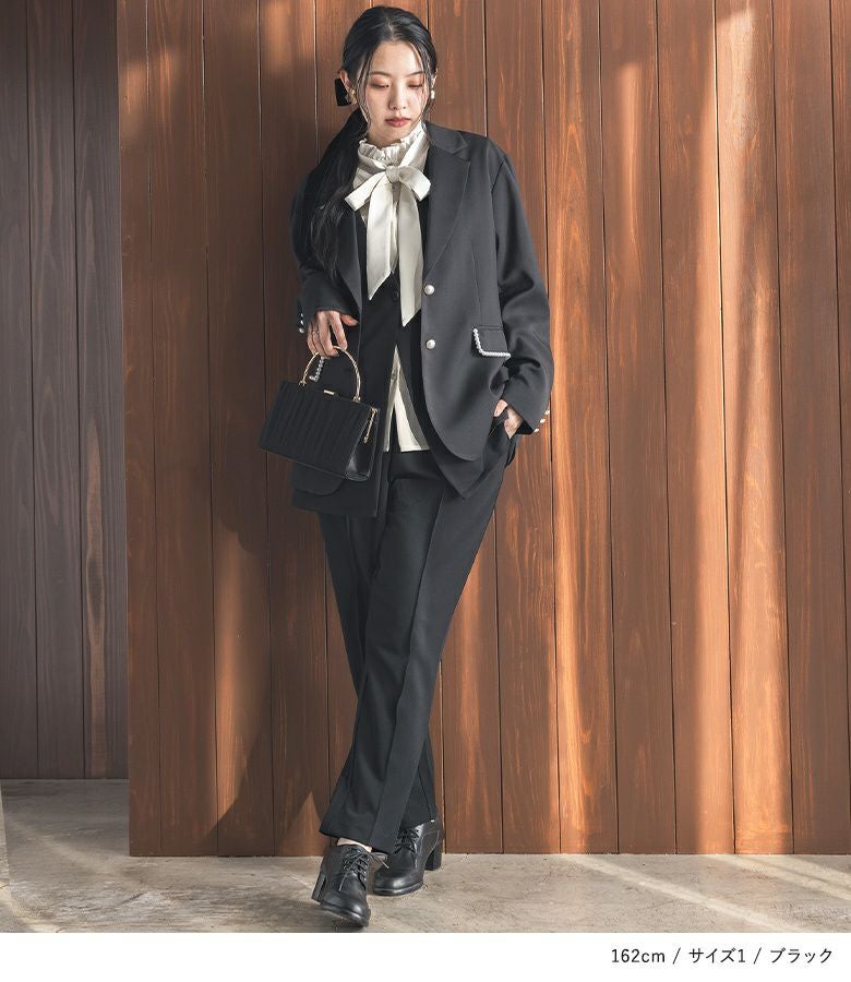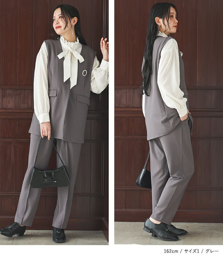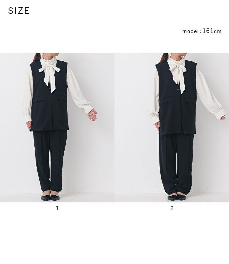 1は、ブラウスとベストはちょうどいいサイズ感で着られました。ボトムスは、伸縮性がある素材のため穿き心地はゆったりですが、見た目はジャストサイズでした。2は、ブラウスとベストはゆったりと着られました。ボトムスは全体的にゆったりですが、すっきりシルエットでした。 私の場合は、2を選びます。