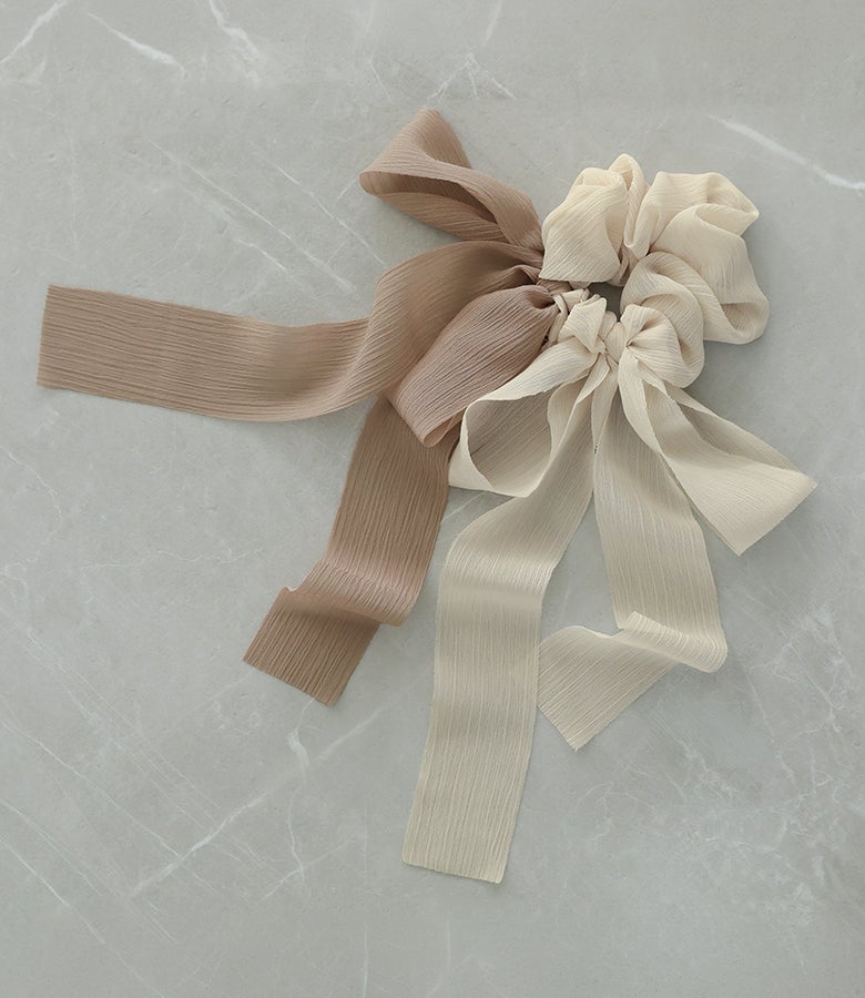 ヘアアレンジによく馴染む、甘くなりすぎないニュアンスカラーと2つのリボンが織りなす柔らかな風合い。