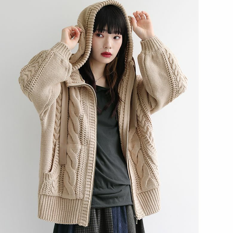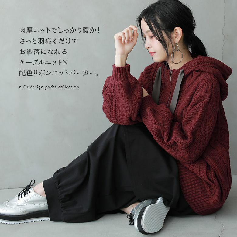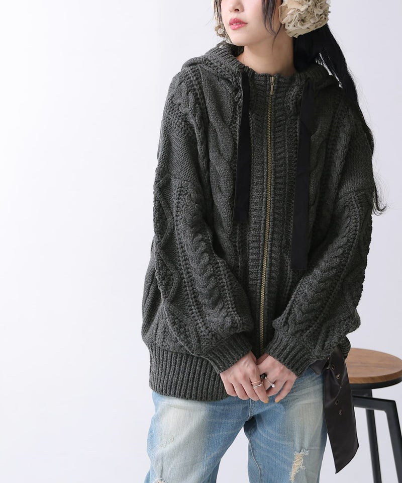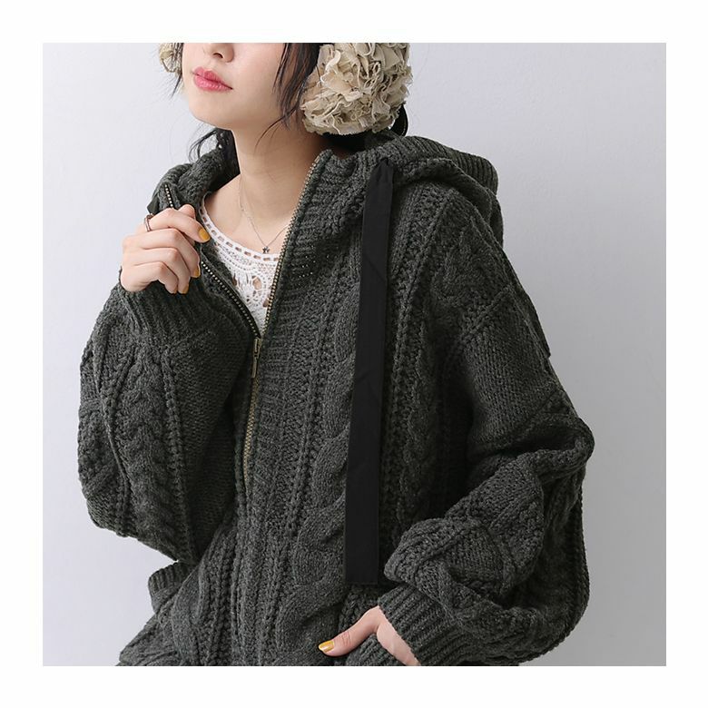 立体感のあるケーブル編みニットと配色リボンがお洒落な個性を放つニットパーカー。