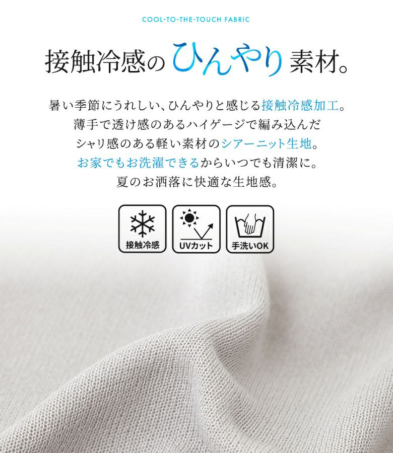やや透け感のあるさらっとした肌触りのハイゲージニット。少しハリ感とシャリ感のある生地で、肌に張り付きにくく涼し気なニットです。UVカット加工付きで紫外線の強い日でも安心。接触冷感加工で暑い季節もひんやり快適に過ごせます。手洗い可能な素材で、お家でお手入れできる嬉しいアイテム。