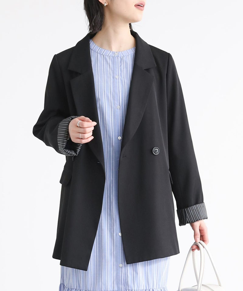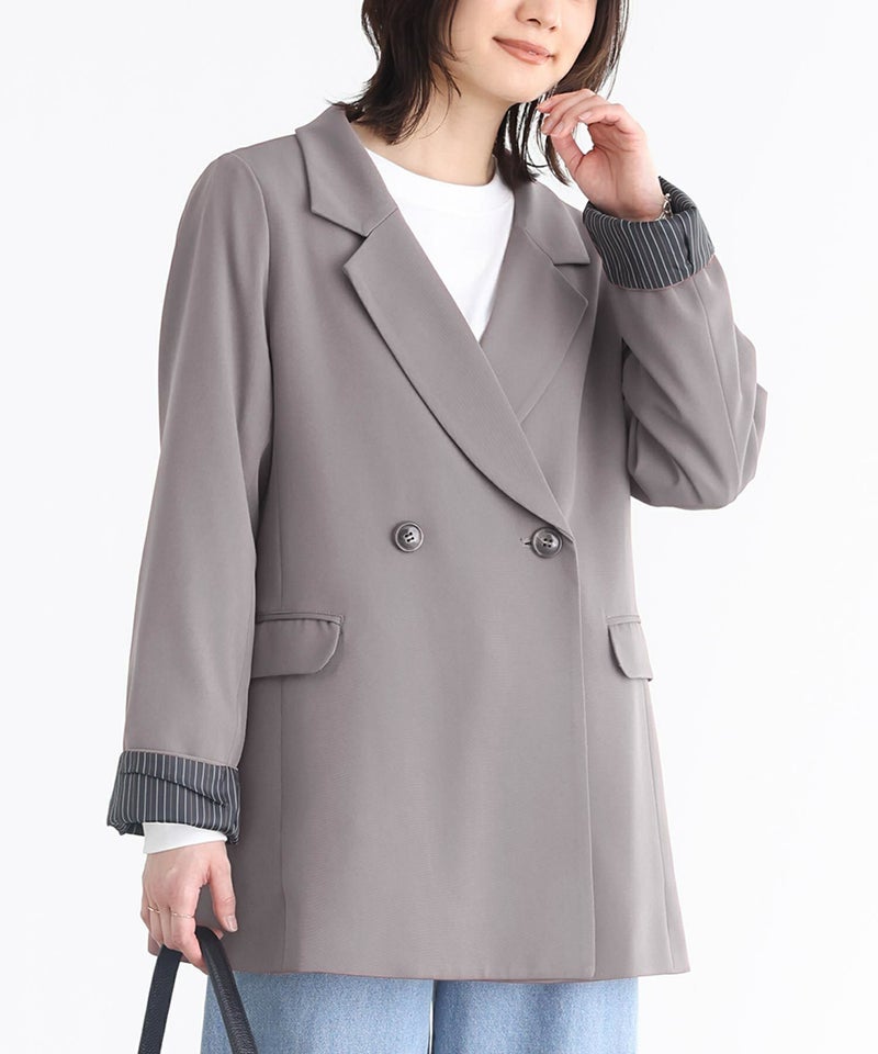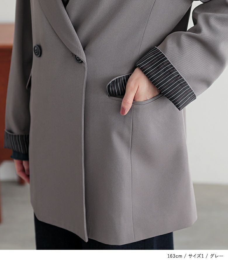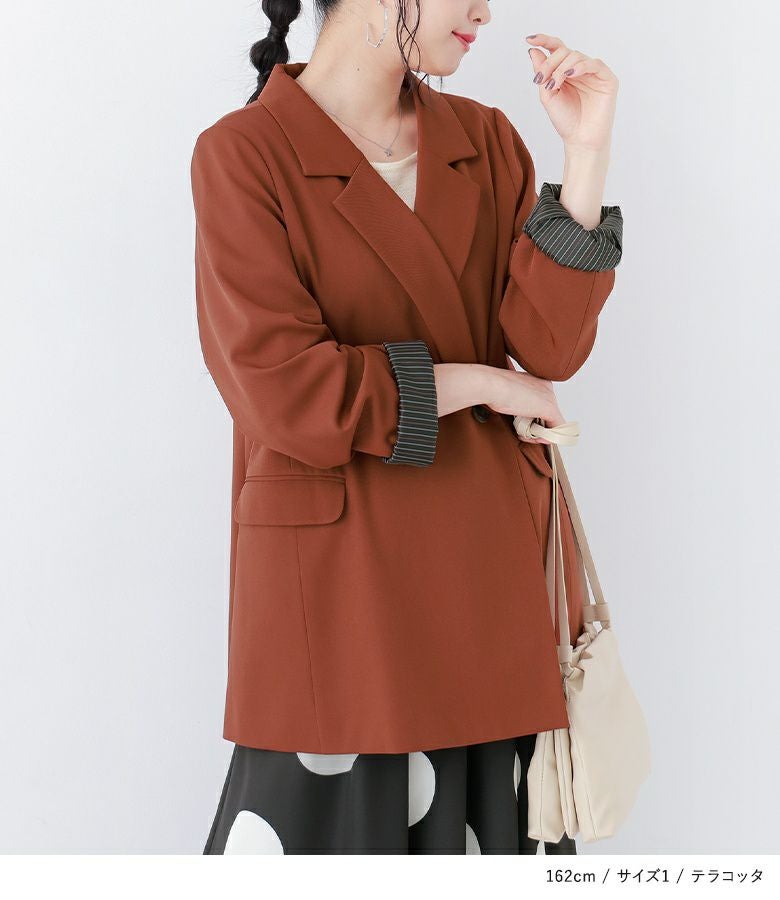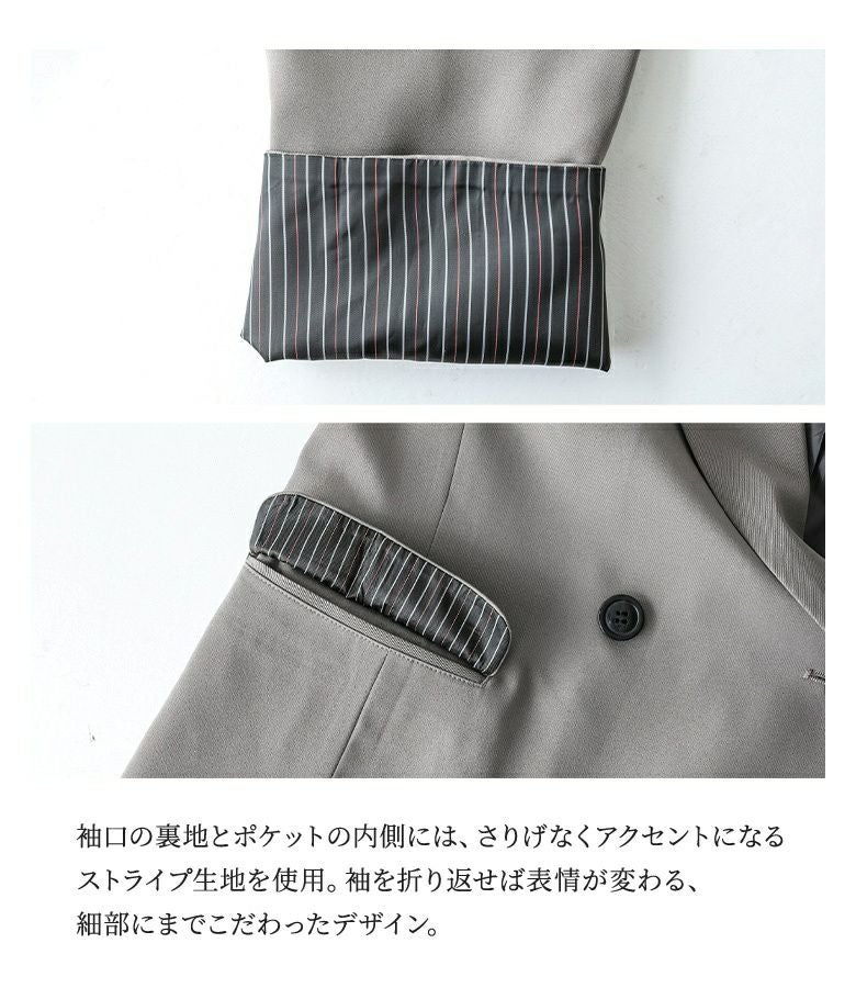 オリジナルパターンだからこそできた綺麗なシルエットが魅力の、ダブルボタンのテーラードジャケット。袖口部分はストライプ柄の裏地付きで、折り返した時もワンポイントになります。カラーごとに異なるデザインボタンや、ポケット蓋の裏側もストライプ柄の生地で、細部までこだわったデザインに。