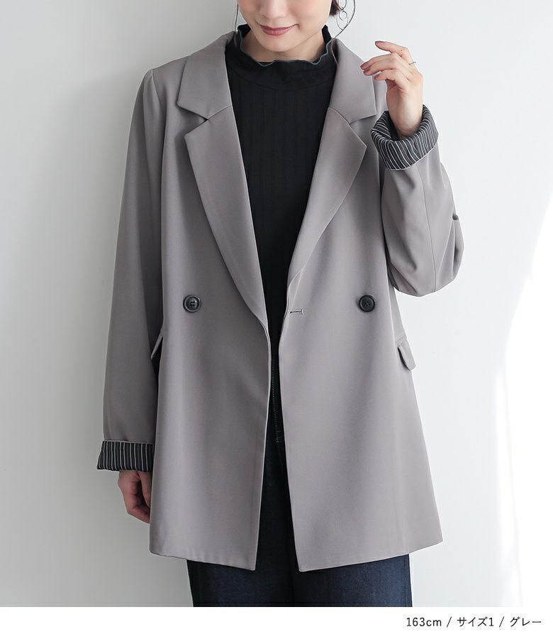 思ったよりしっかりした作りで、パッと見た感じは普通のダブルのジャケットでした。でも袖の裏地がストライプになってるのがかっこいいと思います。カジュアルにもきれいめにも合わせられそうなので便利だと思います。普段LかLLを着ますが、サイズ1で問題なく着れました。