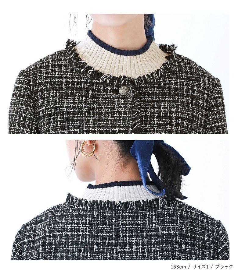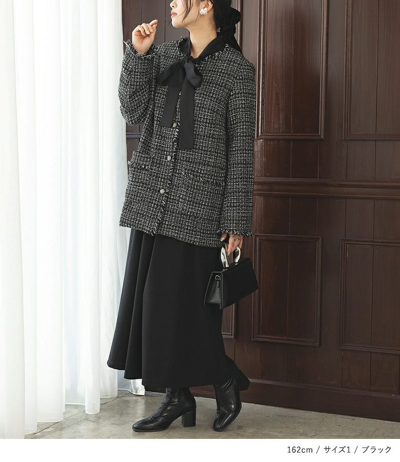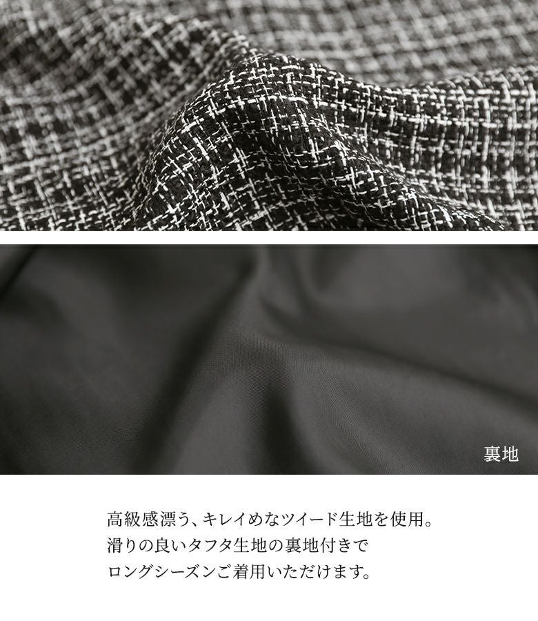 高級感漂う、キレイめなツイード生地。滑りの良いタフタ生地の裏地付きでロングシーズン着用できます。