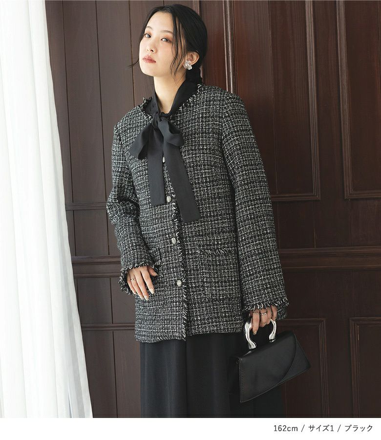 モノトーンでまとめた上品な印象のツイードジャケット。フリンジ使いとヴィンテージ感のあるボタンがアクセントになったデザイン。長め丈のボックスシルエットで旬な着こなしが叶う、セレモニーなど特別なシーンにも着用できるアイテムです。