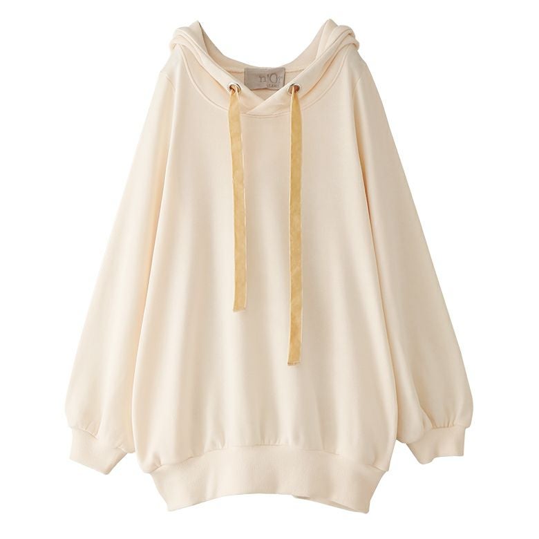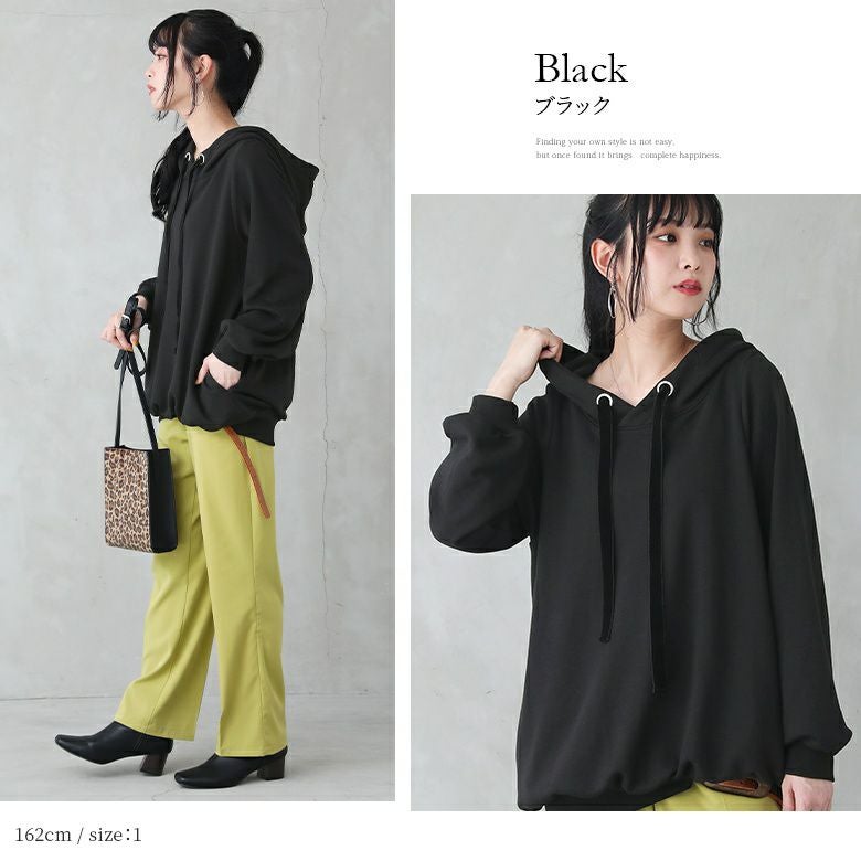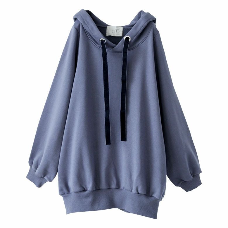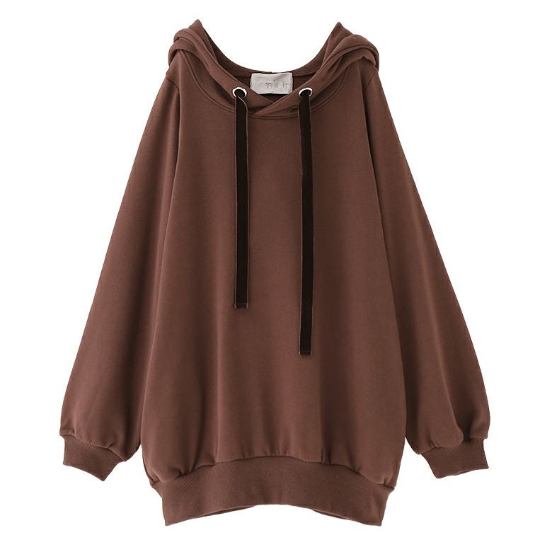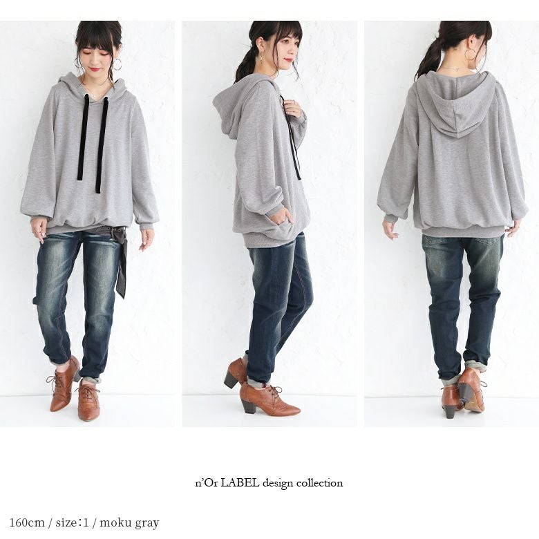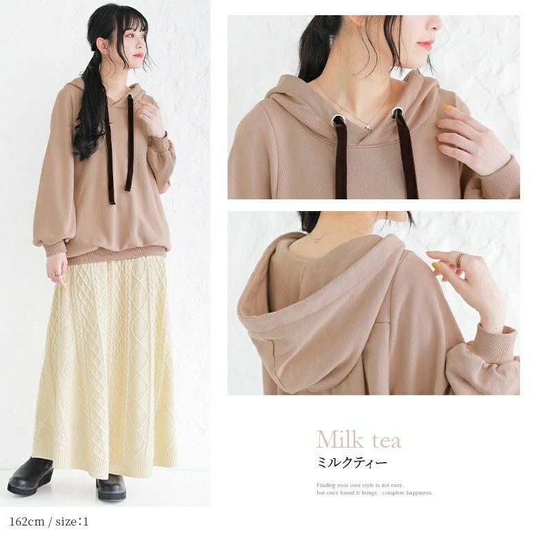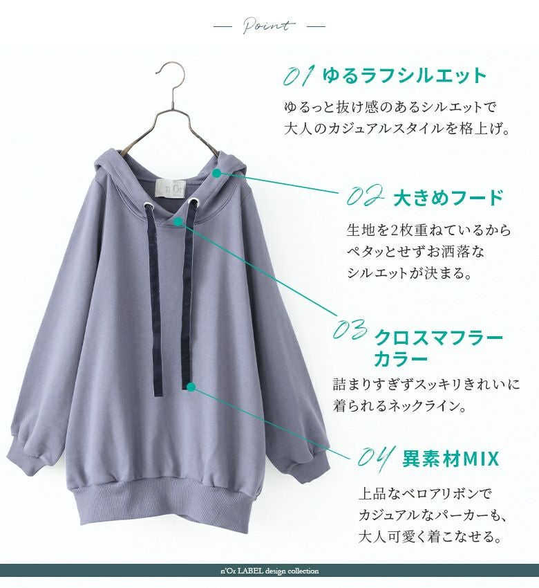 ラフでお洒落なフードデザインなのに、アウターの下に着てもすっきり決まる。首周りはベロアリボンと大きめのハトメデザインがお洒落のアクセントになるから、一着でコーデが映える優秀アイテムです。