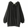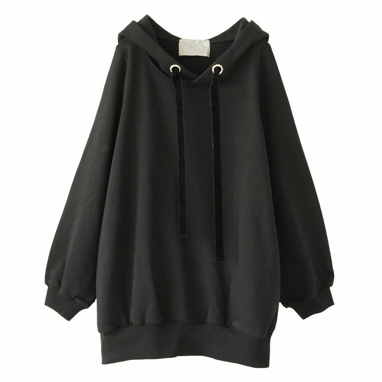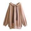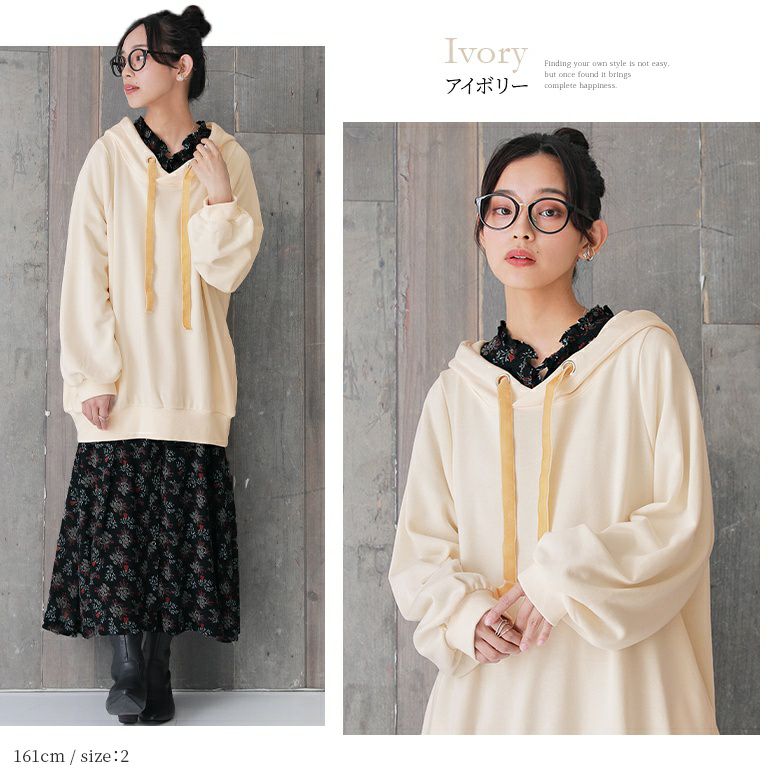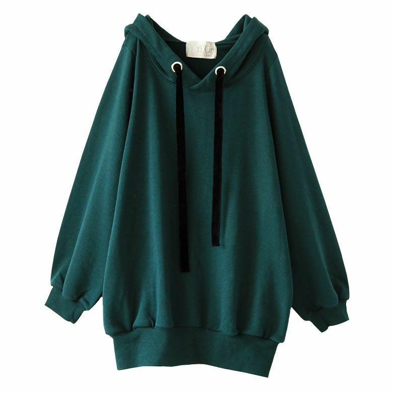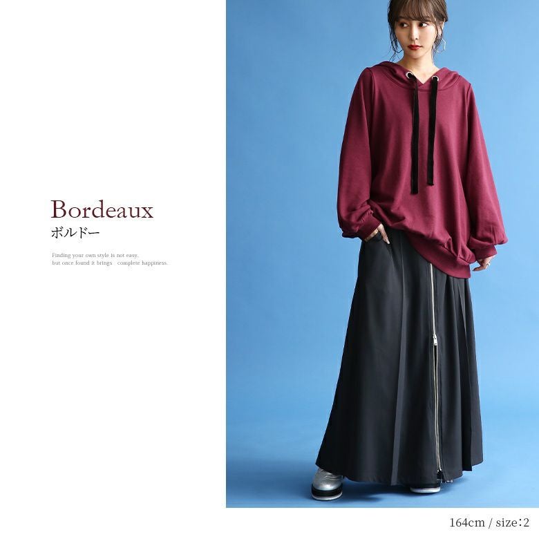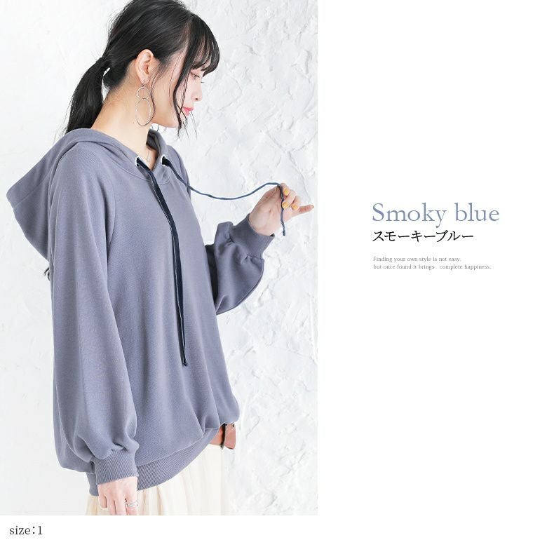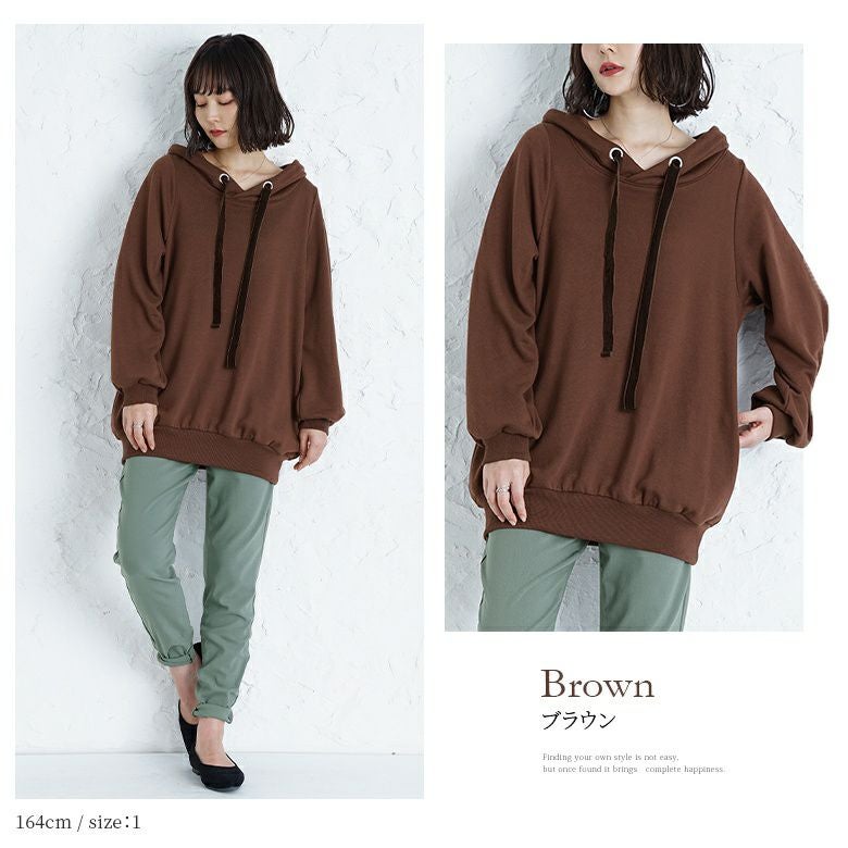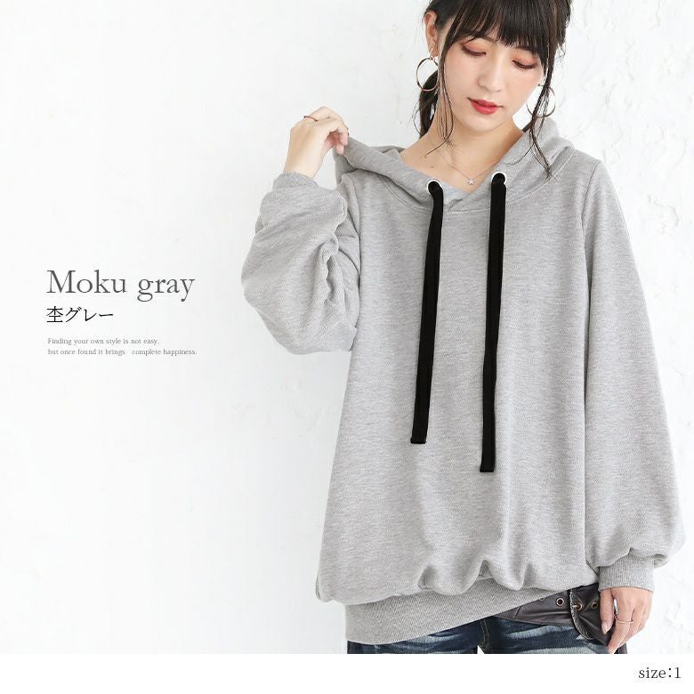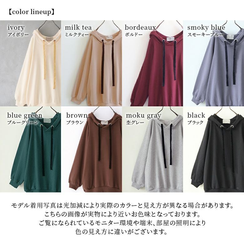ラフでお洒落なフードデザインなのに、アウターの下に着てもすっきり決まる。首周りはベロアリボンと大きめのハトメデザインがお洒落のアクセントになるから、一着でコーデが映える優秀アイテムです。