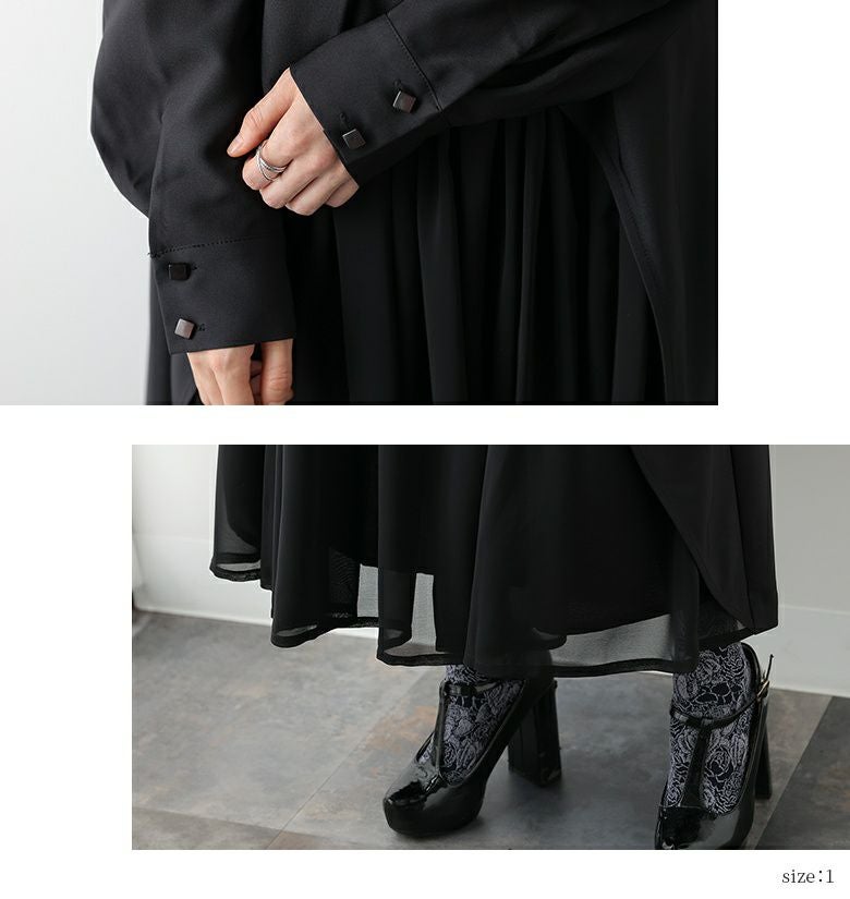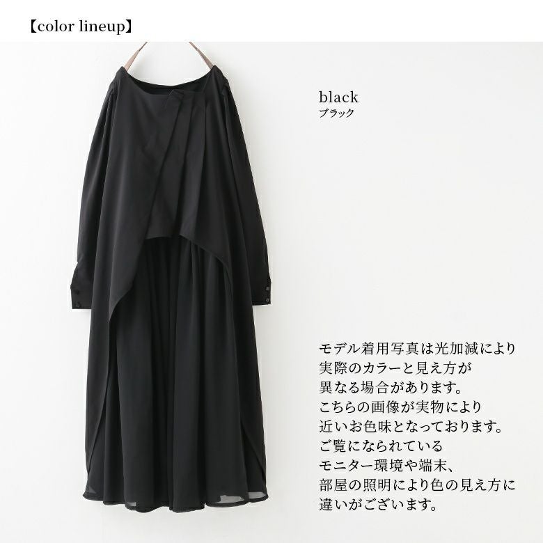 柔らかく落ち感のあるキレイめ生地と、透け感のある軽やかなシフォン生地の異素材が生み出すモードな世界観。たっぷりの生地から生まれるドレープが、動くたびにひらりと軽やかに波打ち視線を惹きつけます。さらに、お好みで選べるM~3Lサイズ展開も嬉しいポイントです。