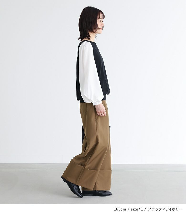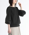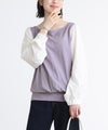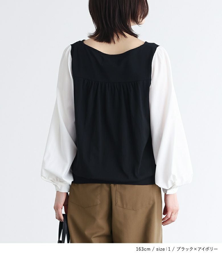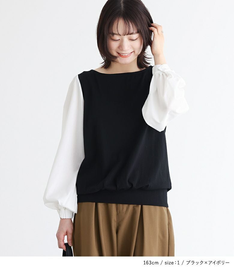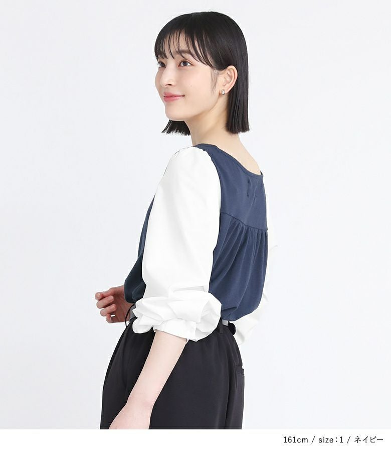 異素材使いとぽわん袖がポイントの配色デザインカットソー。袖口はゴムシャーリングになっており、そのまま長袖で、まくって7分丈・5分丈で、とアレンジができるデザインになっています。メリハリの効いた配色デザインが着こなしのアクセントに。背中はギャザーデザインでバックスタイルもお洒落な一枚。