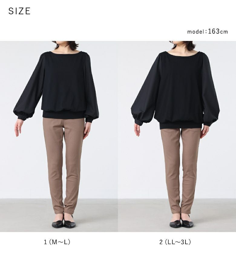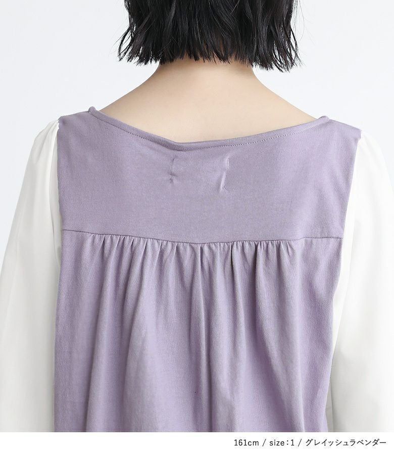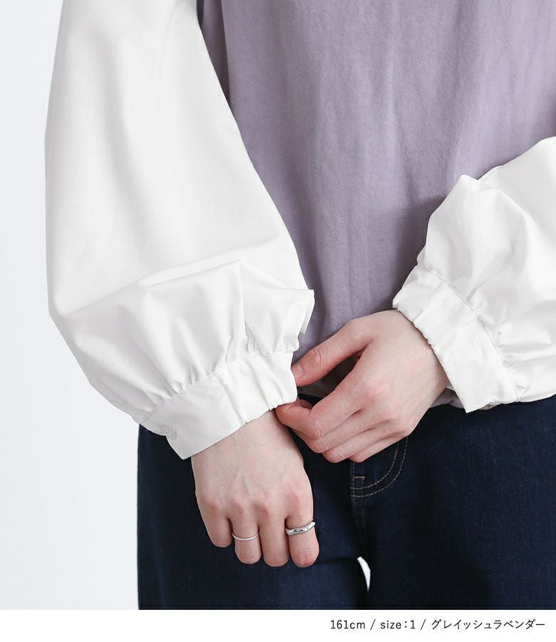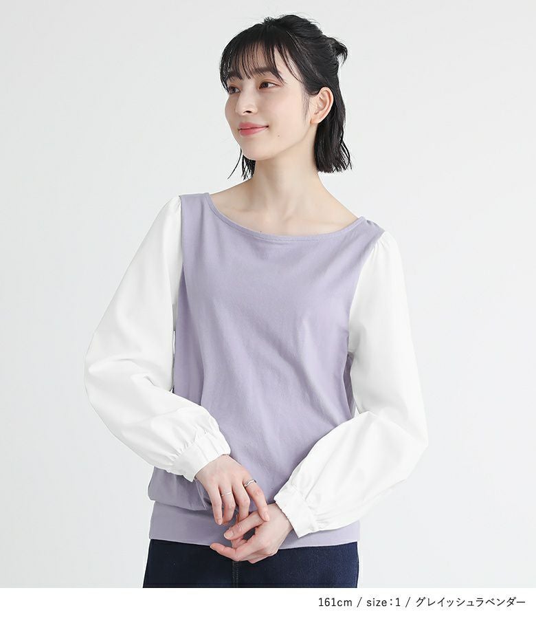 身頃は心地良い肌触りのカットソー生地を使用。袖部分は柔らかな布帛生地で上品見えする素材です。