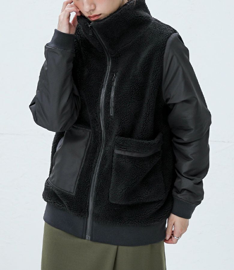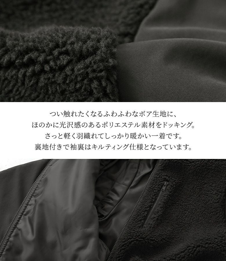 ふわふわで心地よいボアとほのかな光沢感のあるブルゾン素材の、センス漂う異素材使い。しっかり裏地付き&袖裏のキルティング仕様で、細部までこだわり抜いたアイテムです。