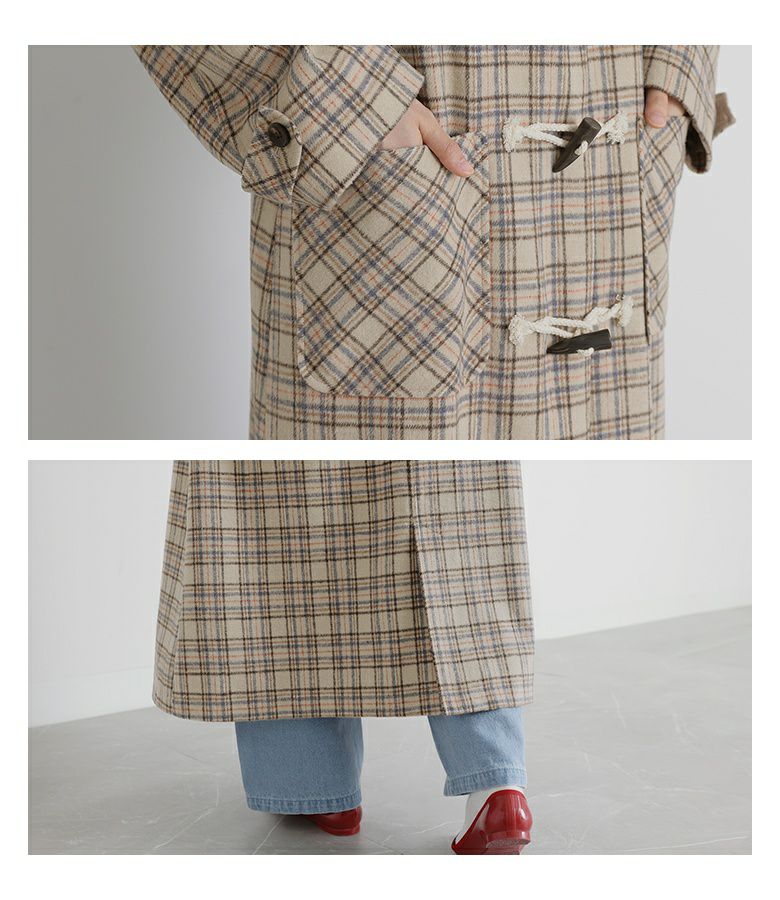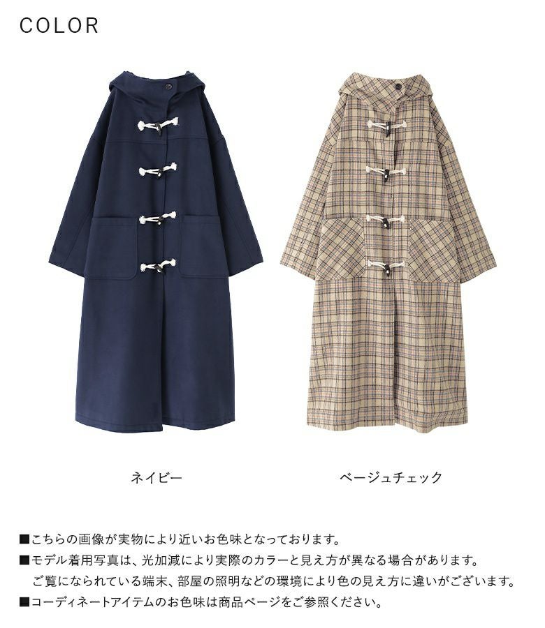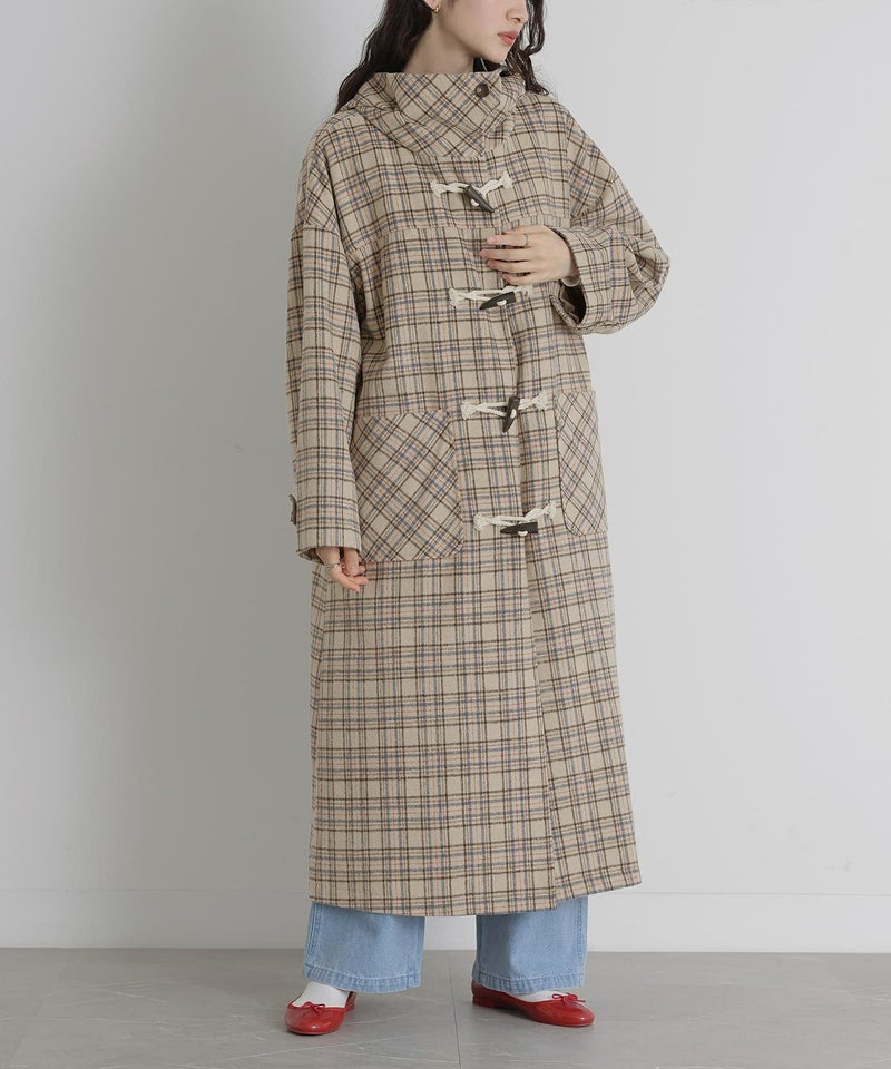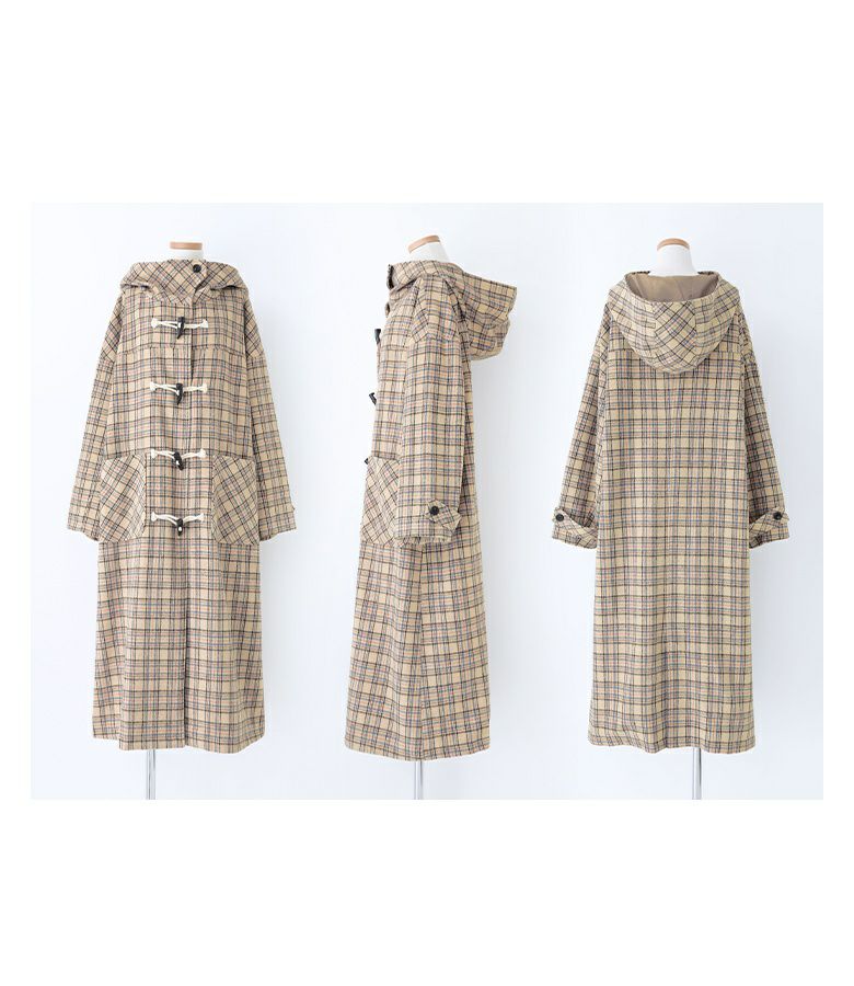 somariらしくデザイン性にもこだわったダッフルコート。かっちりとしたイメージのダッフルコートですが、ドロップショルダーにすることでゆるっと羽織れてこなれ見えするシルエットに。フードボタンはポイントになるようほんのりアシンメトリーにデザインし、大きめのスタンドフードで小顔効果も期待できます。後ろ裾はベンツ開きにしてロング丈でも快適な足さばきを叶える仕様です。ベーシックで合わせるアイテムを選ばない無地デザインと、秋冬コーデのアクセントになるチェック柄デザインでご用意いたしました。チェック柄デザインはパッチポケットと袖タブ部分をバイアス仕様にして、アクセントにしました。