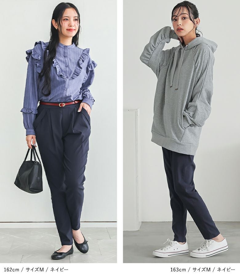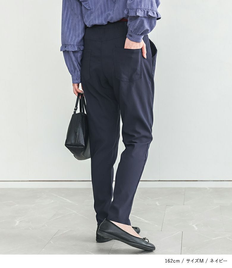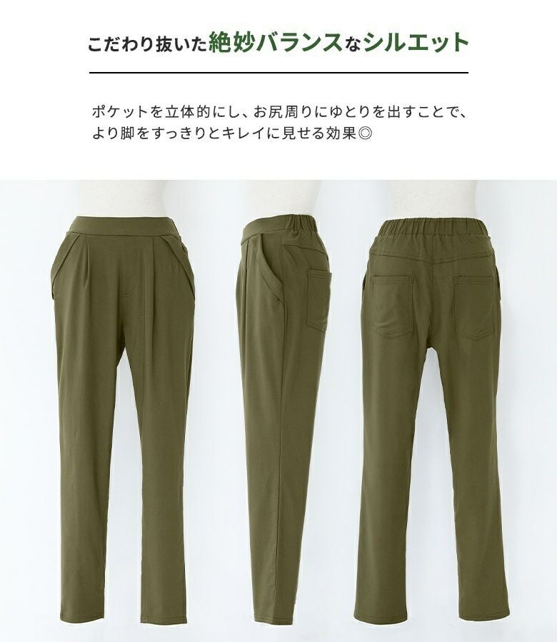 ■デザイン お尻から太もも周りはゆったりと、裾に向かって細くなるシルエットで、気になる部分はカバーしながら、美脚見せを叶えるテーパードパンツ。腰周りがすっきりと見えるサイズ感と、両サイド&バックのポケットがヒップラインを美しくカバーします。