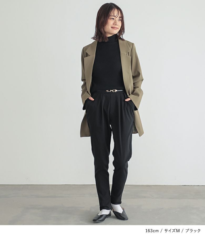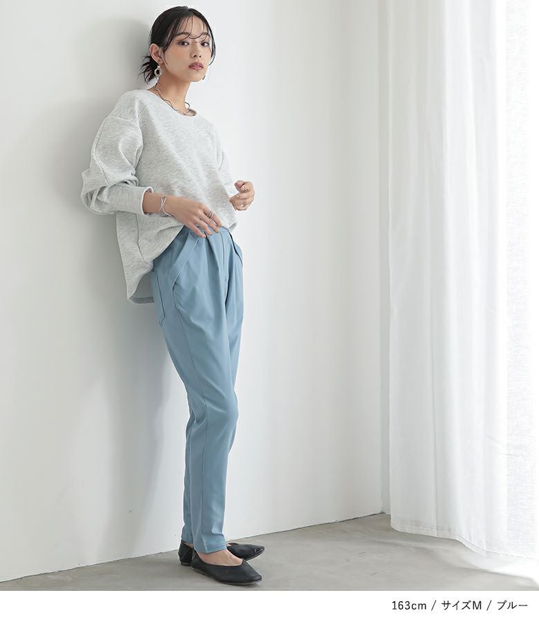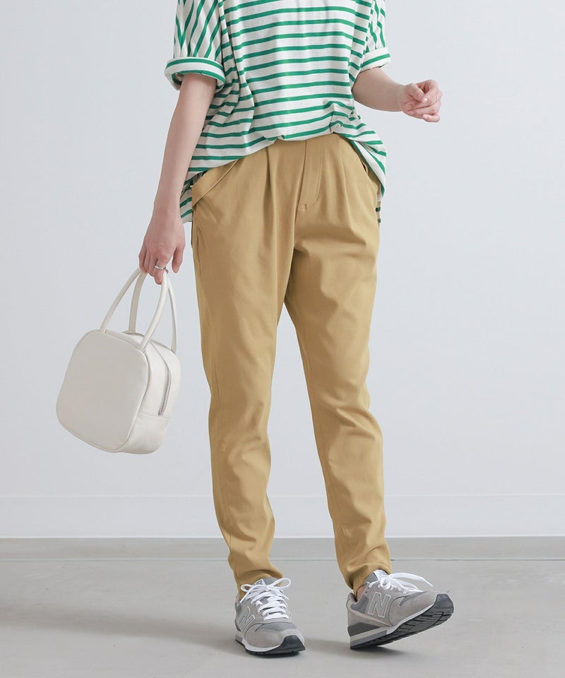 ■コーディネート ゆったり穿けてきちんと感もあるテーパードシルエットなので、キレイめスタイルからカジュアルスタイルなど様々な着こなしを楽しむことができます。長めの着丈なので、裾上げをしてアンクル丈としてお召しいただくのもオススメです。 |