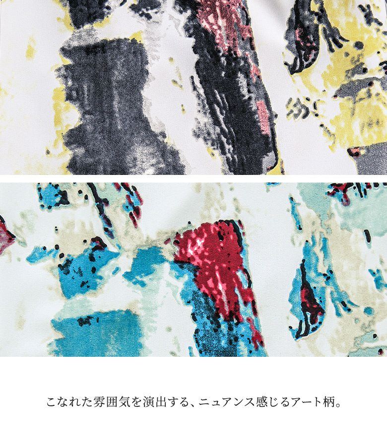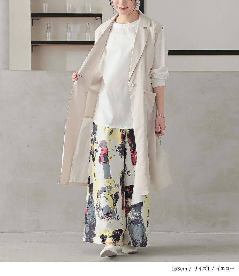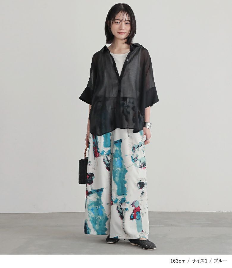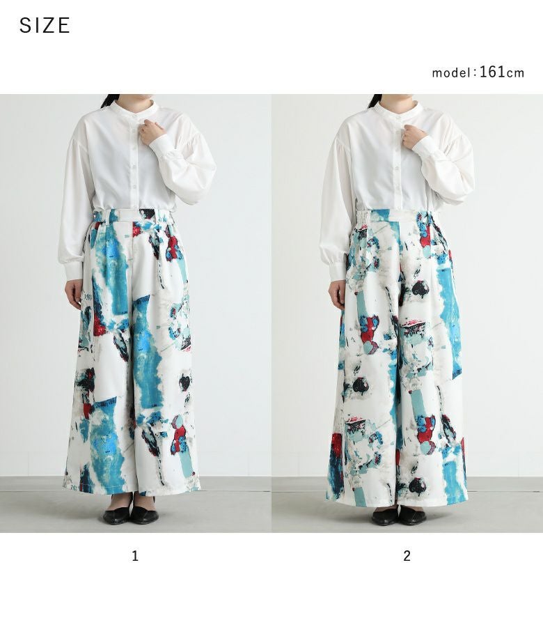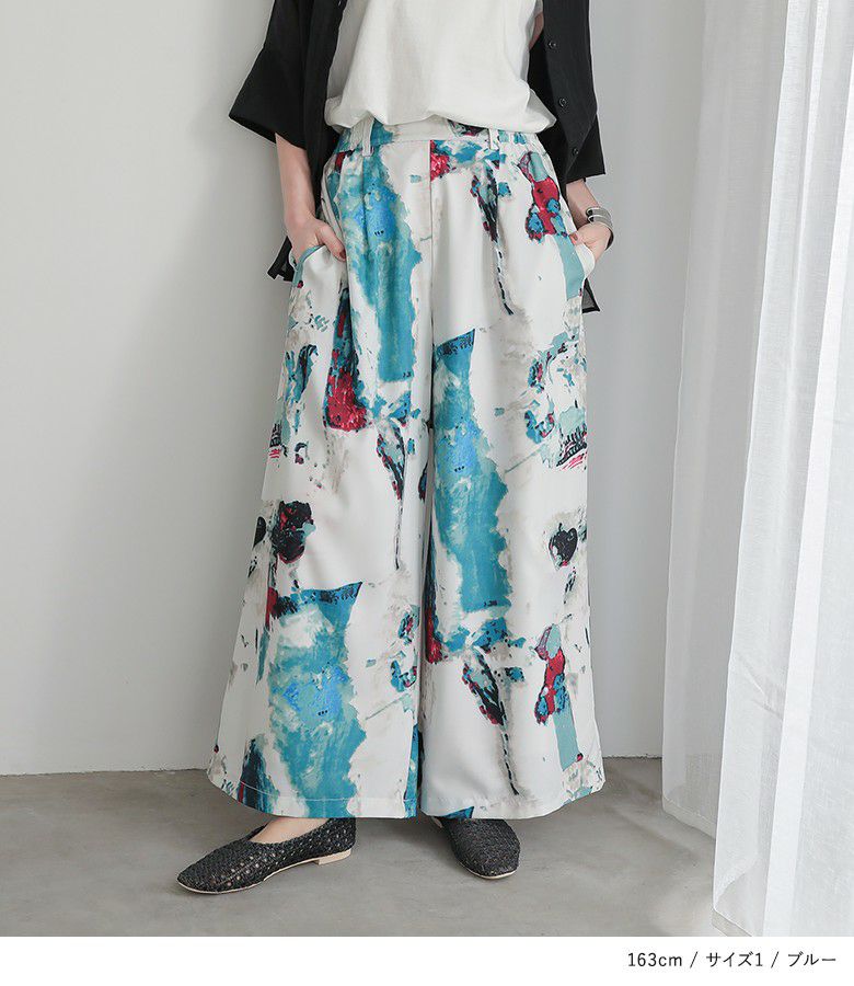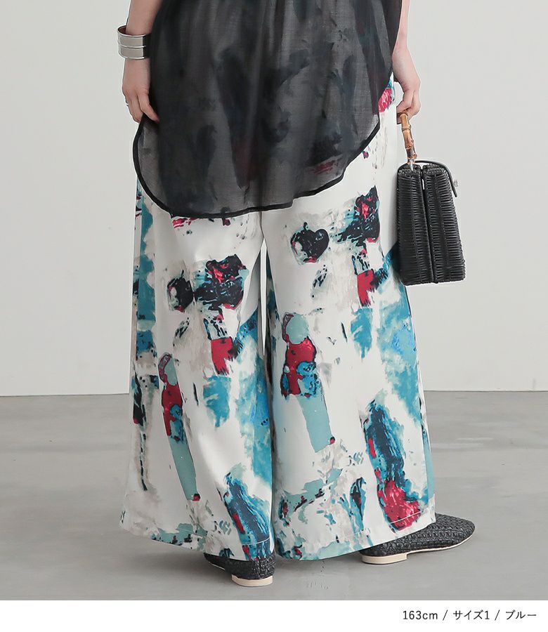 選べるM~3Lサイズ展開!溢れる存在感、水彩プリントワイドパンツ。