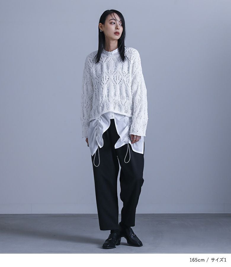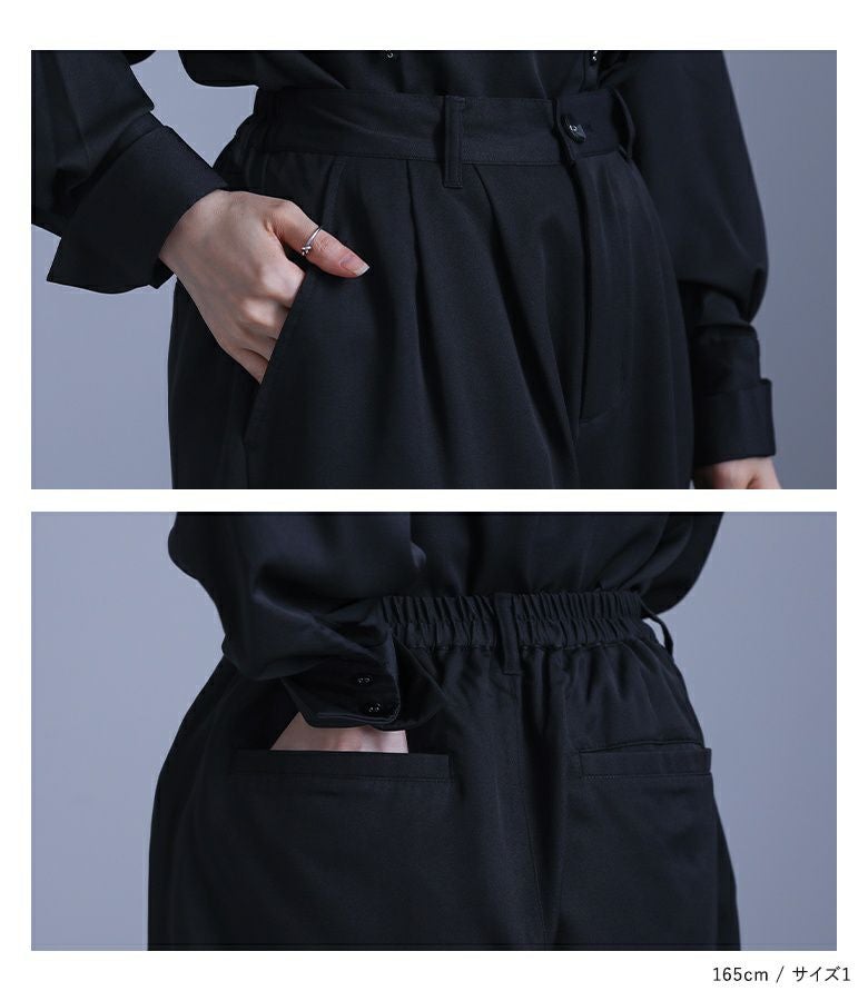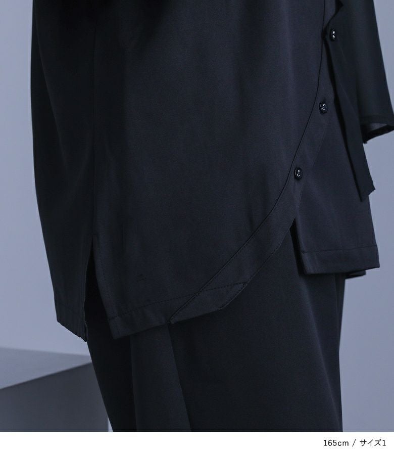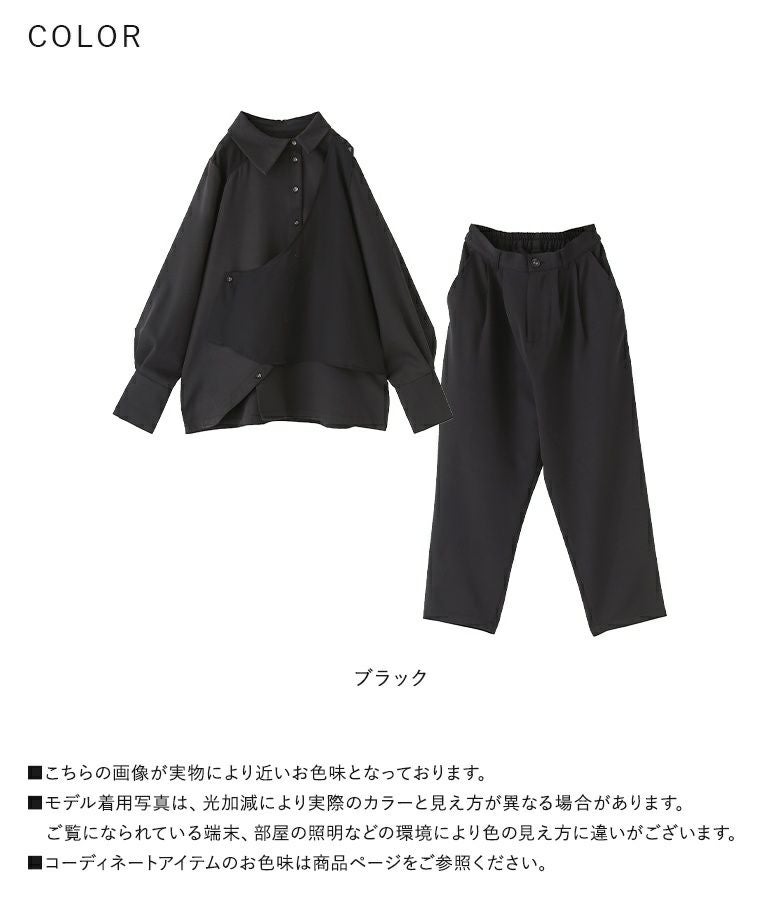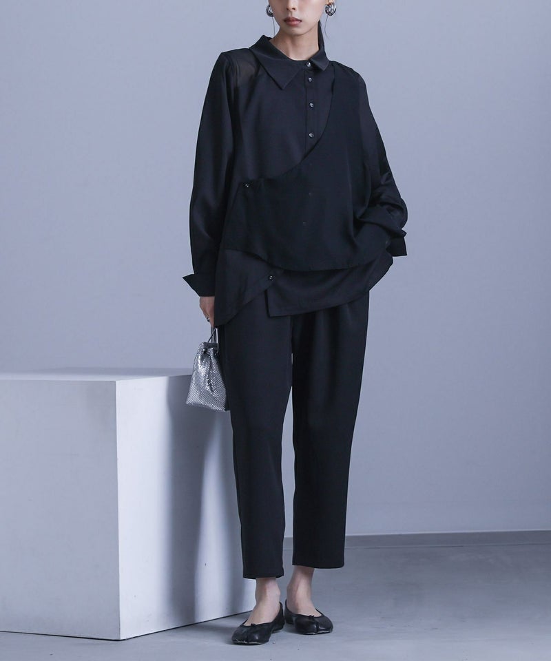 洗練されたオケージョンスタイルに導く、シャツとパンツのセットアップ。トップスは、ボタンを留める位置でアレンジを楽しめるシフォン生地を重ねたジレや、アシンメトリーの襟、透けすぎない右肩のシフォン切り替え、二つ折りにできるカフスなど、さりげなく個性的に見せるこだわりを詰め込みました。大きめのアームホールでラフに着られるのも嬉しいポイント。パンツは抜け感のあるクロップド丈で、タックの入ったヒップ周りにゆとりがあるコクーンシルエット。ウエストはバックゴム仕様でラクに穿けて、インしてもスッキリ見えします。