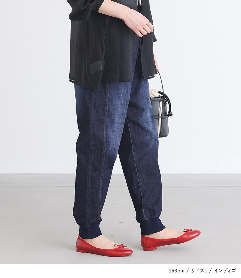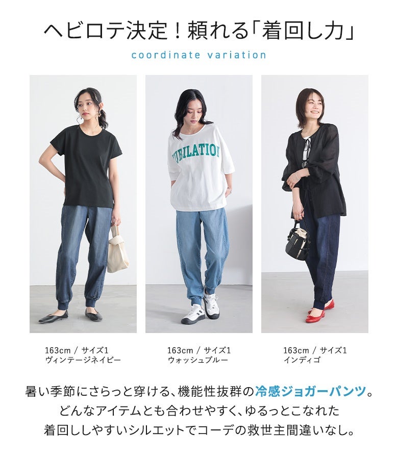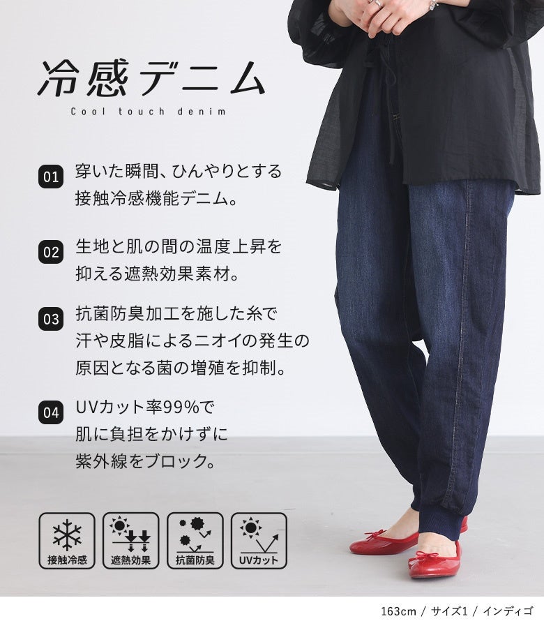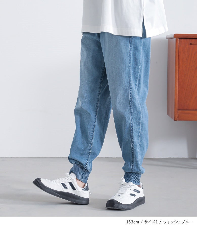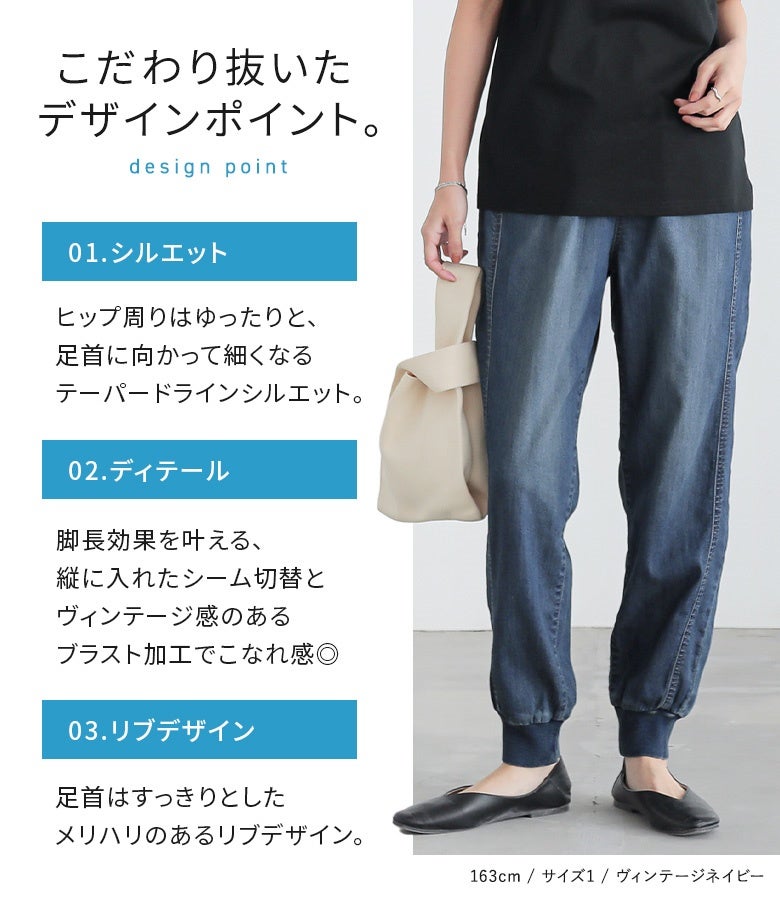 ヒップ周りはゆったりと、足首に向かって細くなるテーパードシルエットが魅力のひんやり冷感デニムジョガーパンツ。脚長効果が期待できる縦に入れたシーム切り替えと、ヴィンテージ感のあるブラスト加工がこなれ感をプラスします。足首はメリハリのあるリブデザインですっきりシルエットに。前後には便利なポケット付きです。