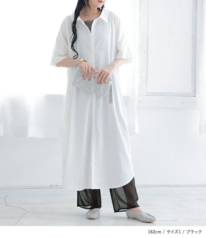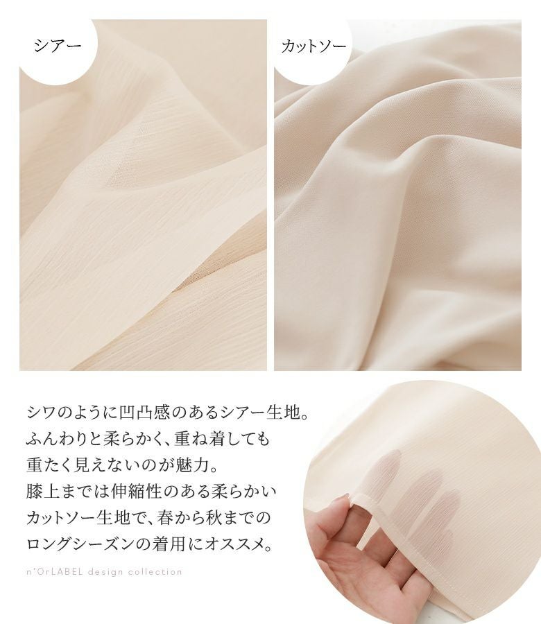 シワのように凹凸感のあるシアー生地。ふんわりと柔らかく、重ね着しても重たく見えないのが魅力。膝上までは伸縮性のある柔らかいカットソー生地で快適な着心地を実現します。