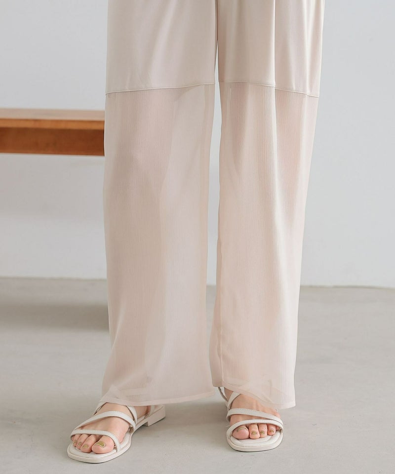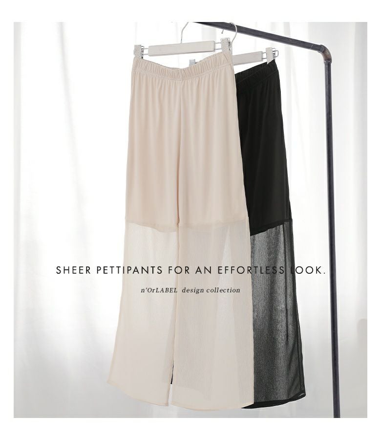 コーデにプラスするだけで、「ラク」に「お洒落」を叶える裾シアーペチパンツ。重ね着がしやすい、こだわりのワイドシルエットでどんなコーデもトレンド感溢れる印象に。
