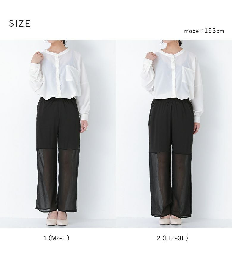 1(M~L)は、程よくゆとりもあり、スッキリと綺麗なシルエットで穿けました。2(LL~3L)は、ゆったりとしたサイズ感ですが、シルエットが大きすぎることはなかったです。私の場合は、1(M~L)を選びます♪