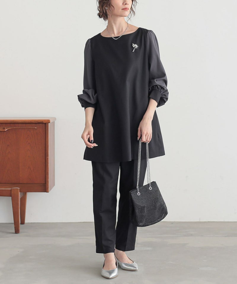 チュニック丈トップスとテーパードパンツのセットアップで着られる2点セット。異素材使いと配色感がアクセントになり、シルエットにこだわったオリジナルパターンが魅力です。