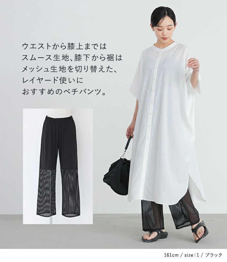 膝部分でメッシュ素材に切り替えたペチパンツ。夏場など暑いときのレイヤードスタイルを涼やかに、且つかっこ良くお洒落に見せてくれるアイテムです。ウエストはゴムで楽な穿き心地。