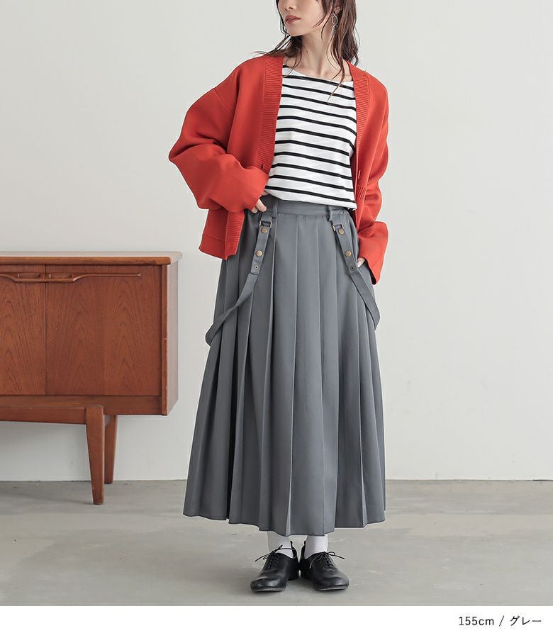 ありそうでなかった、普通とはちょっと違うサスペンダー付きの大人めプリーツスカート。気取らず、ゆるっとラフにお洒落を楽しめます。
