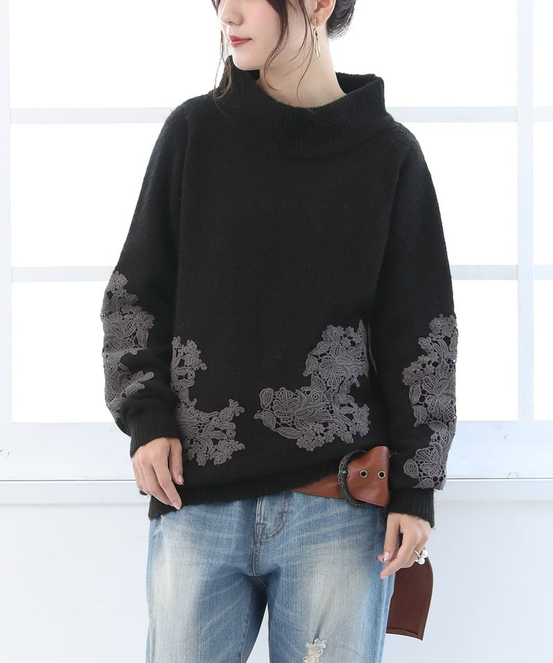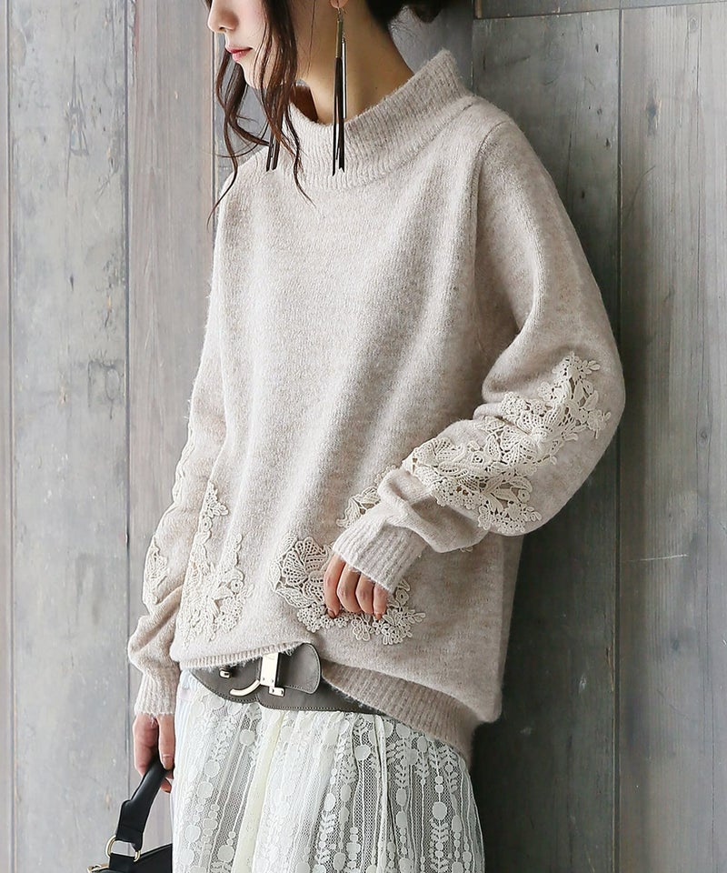 シンプルニットにさり気なく華を添えるのは、大人女子の心を掴むモチーフレース。大きめスタンドネックが顔周りを華奢に魅せ、デイリーコーデに女性らしさをプラスします。