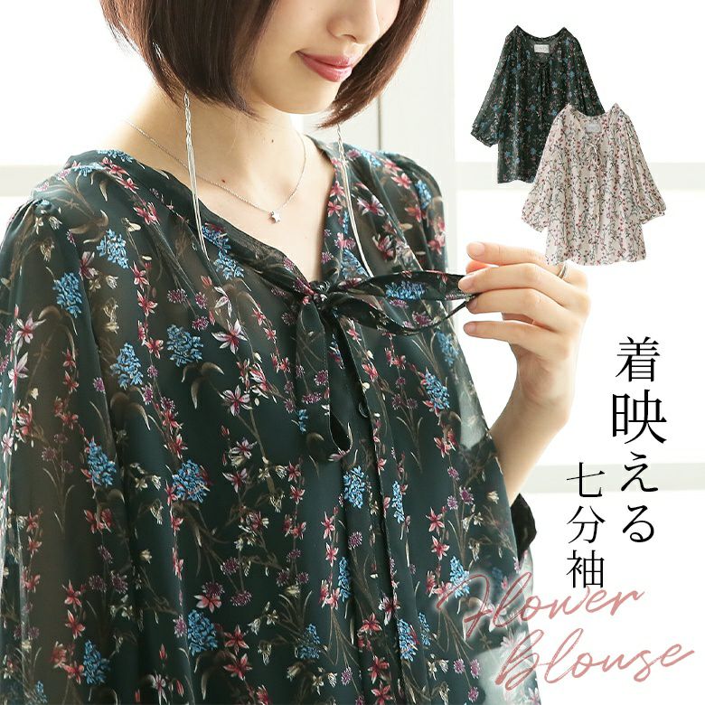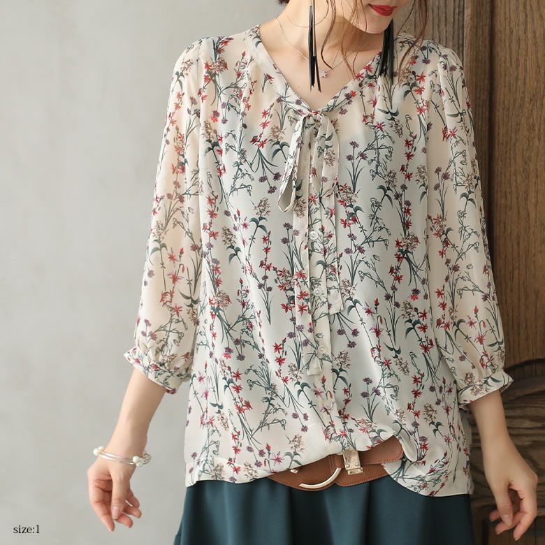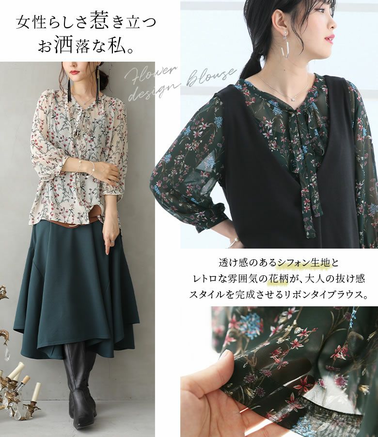 シアーなシフォン生地とレトロな雰囲気の花柄が、大人の抜け感スタイルを完成させるリボンタイブラウス♪