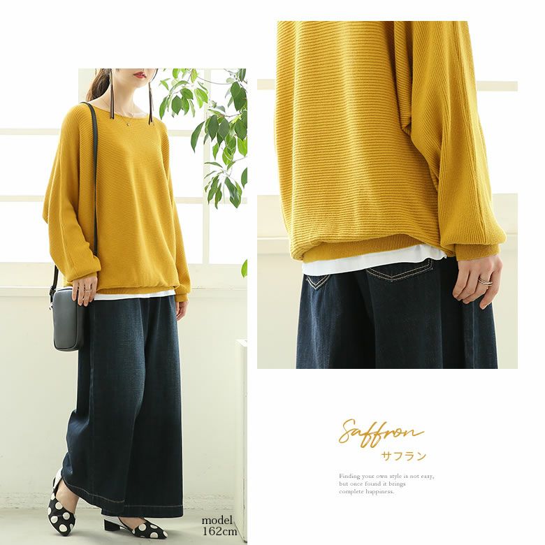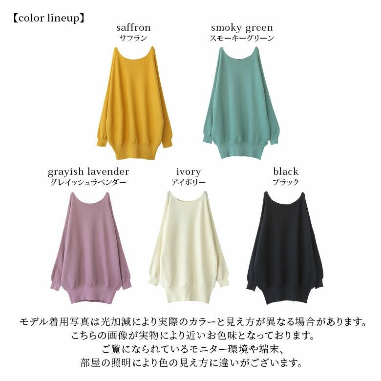 サフランがとてもキレイな色でお気に入りです。ドルマン袖で着やすいです。ブラックも購入しました。薄手ですが、軽くていいと思います。