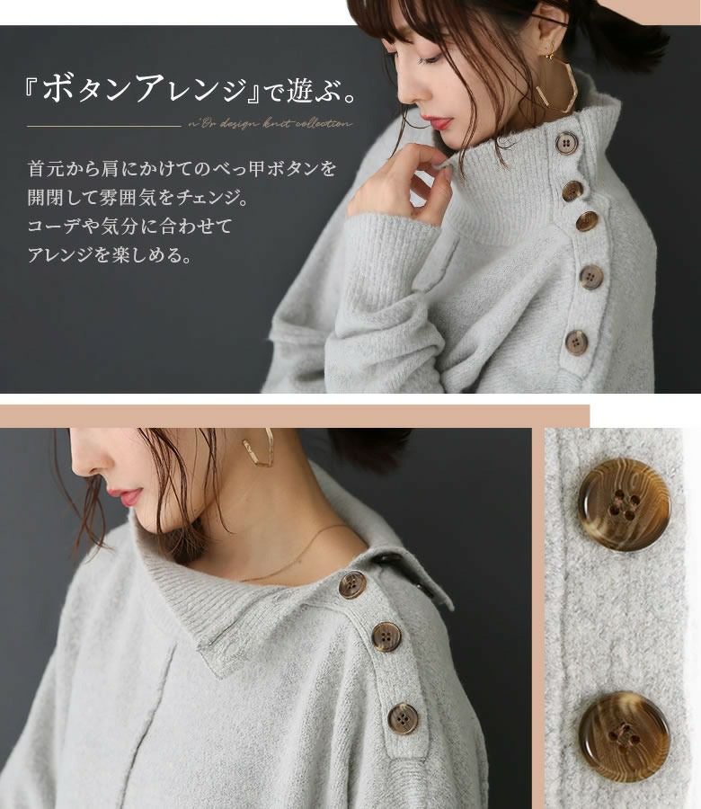 襟元から肩に掛けて施されたべっ甲ボタンを開閉することで、自分らしいアレンジが楽しめるニットプルオーバー♪