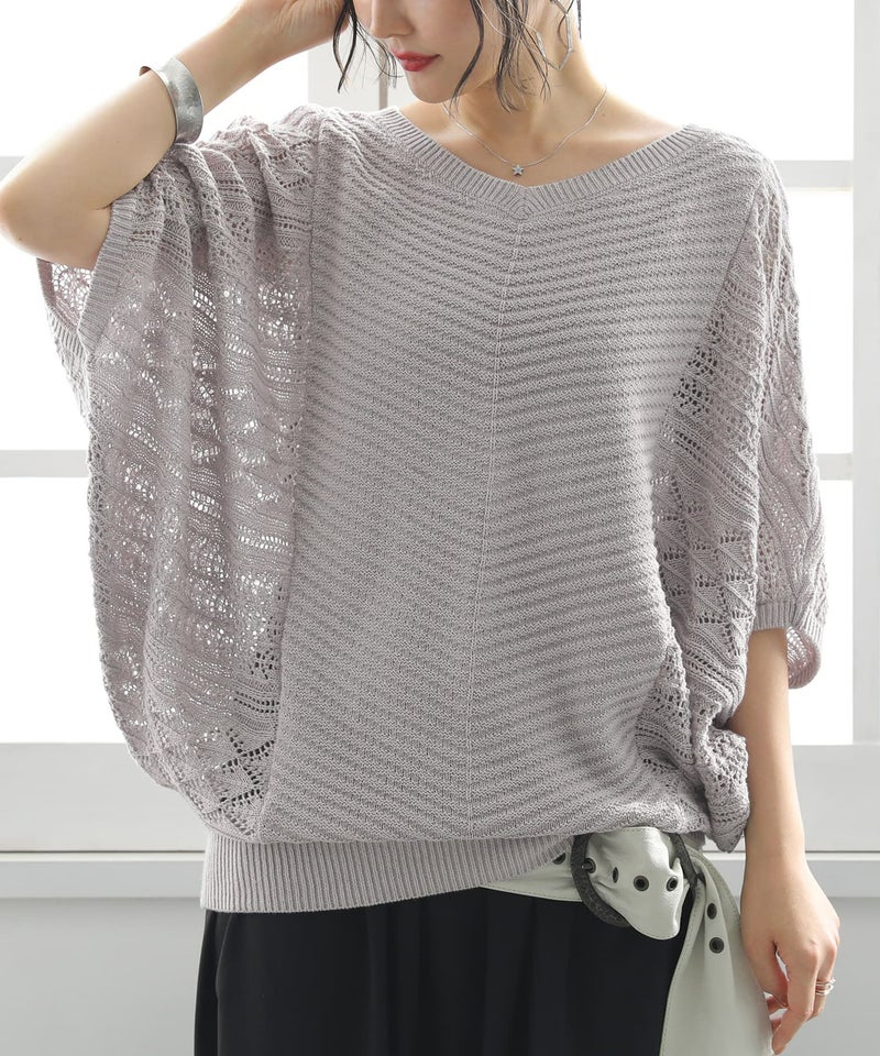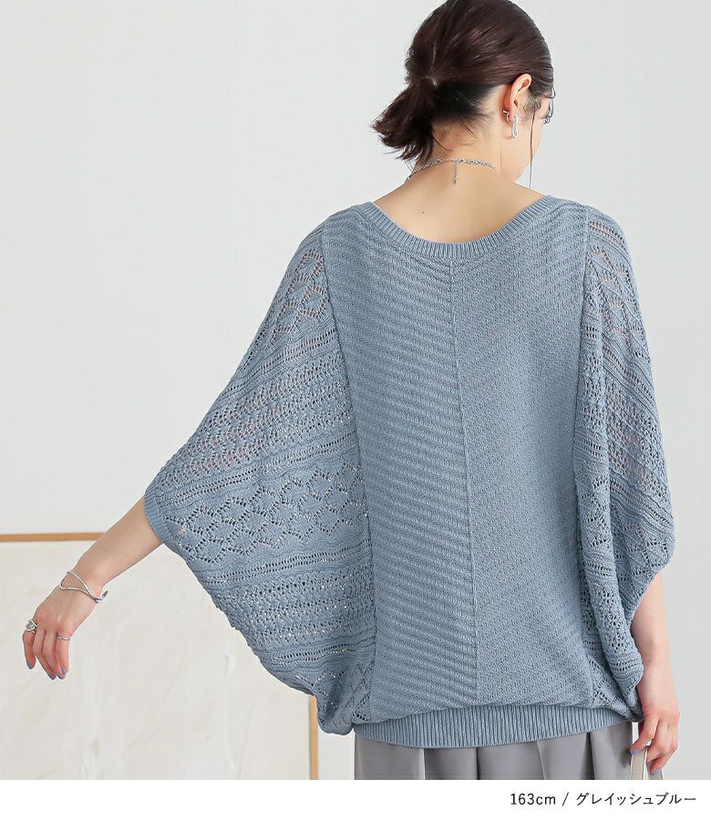 身頃と袖で透け感も柄も異なる、表情豊かな透かし編みに見惚れる。こだわりのゆったりドルマンシルエットがこなれ感を演出します。