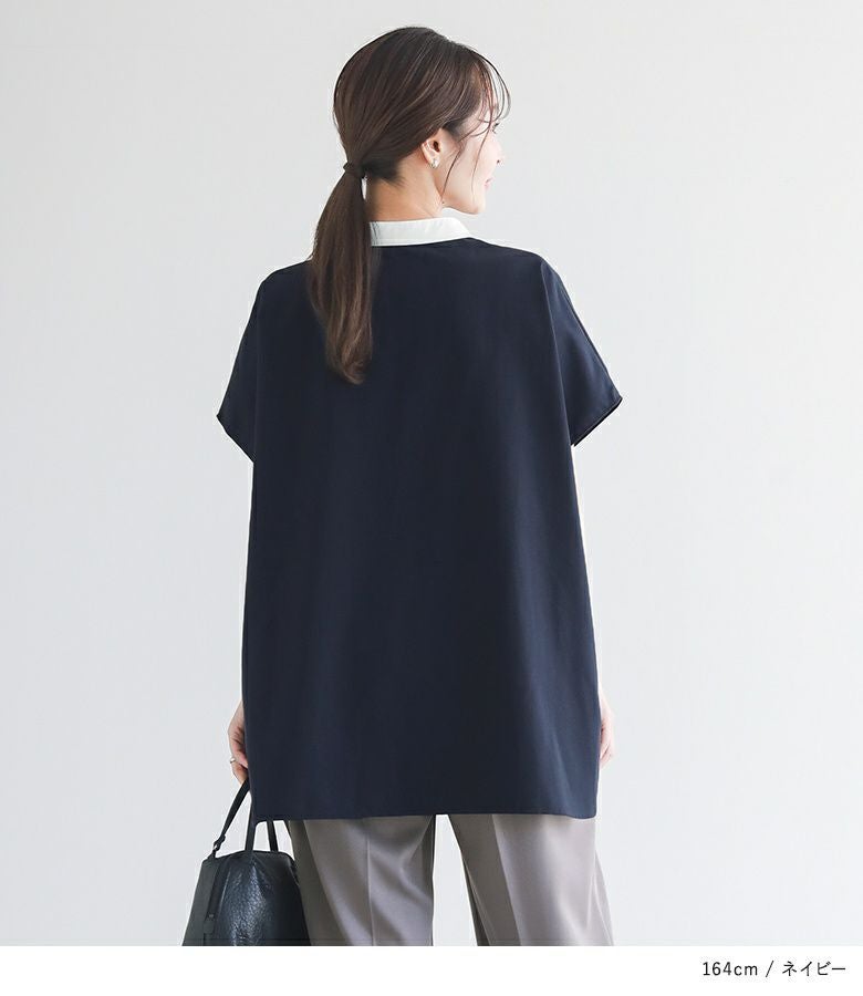 ゆったりしたデザインながらも襟元の白がキチンと感も出してくれます。素材が洗濯手洗いモードしてますアイロンいらずでサッと着脱できボトムスにより変化も付けれて毎日色違いで購入しました。追加購入考えてます。オススメです。着心地も最高です。