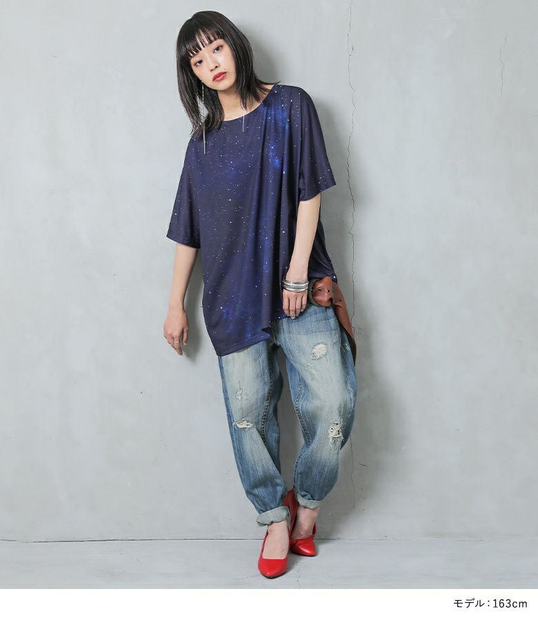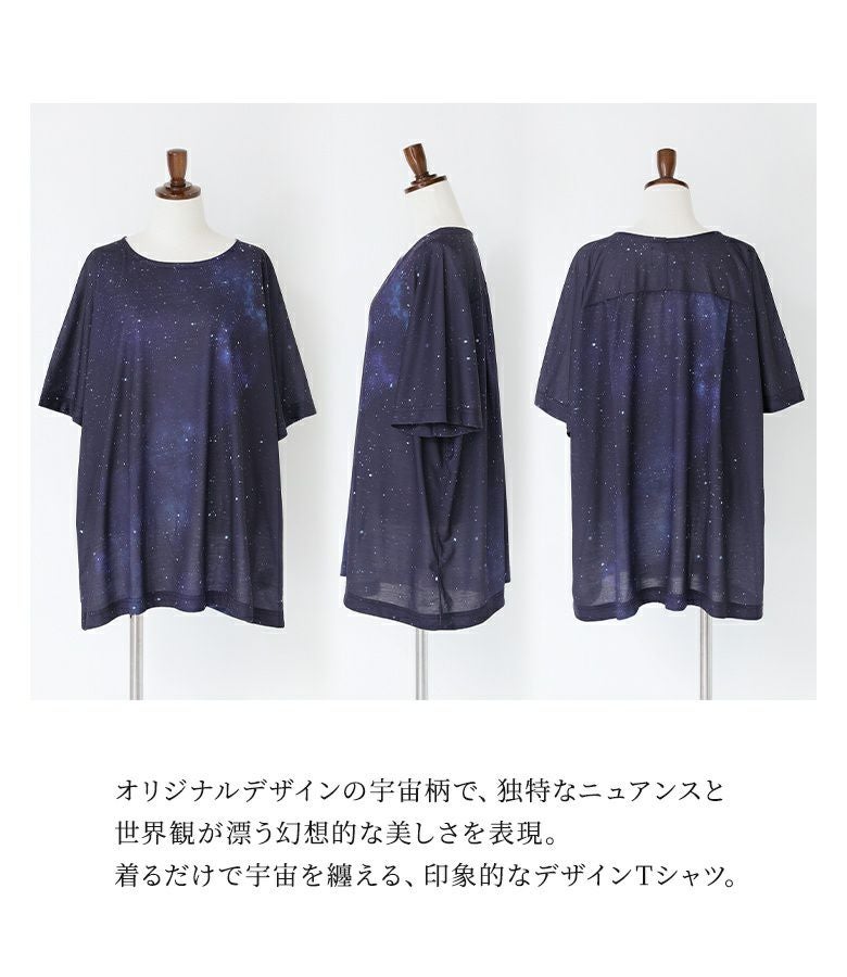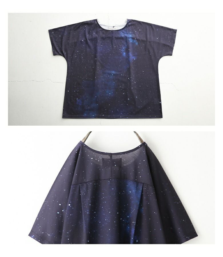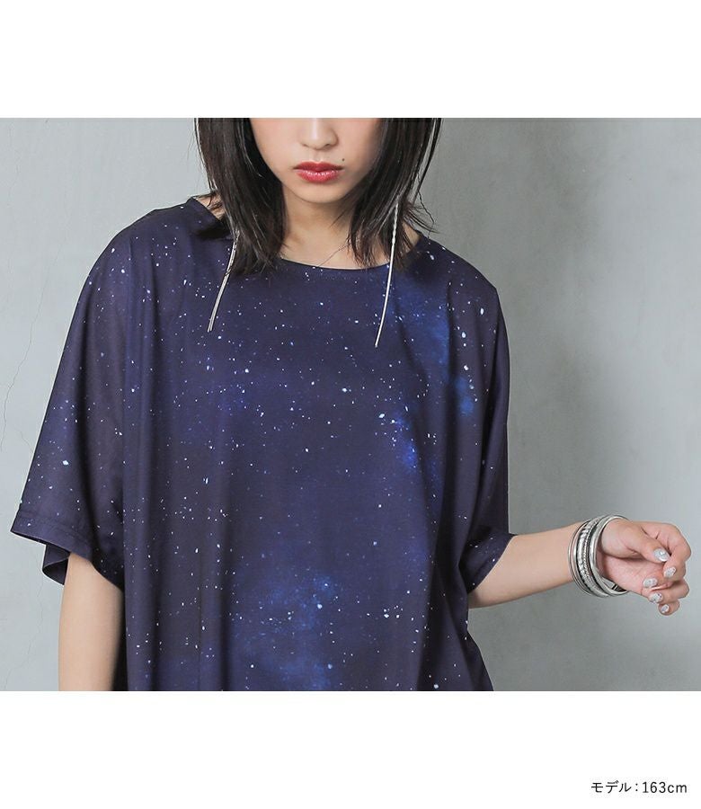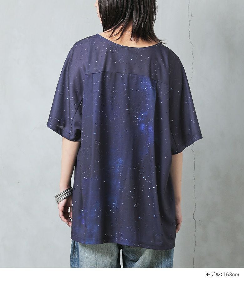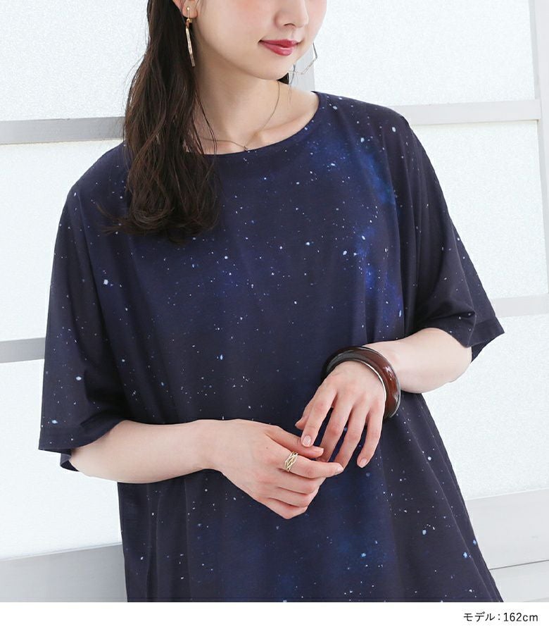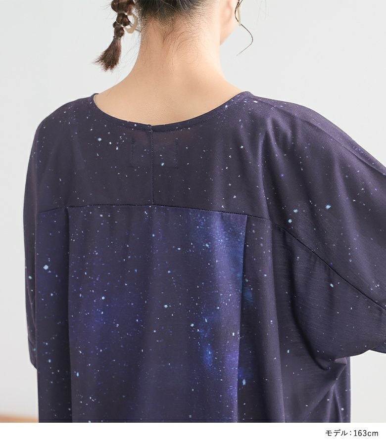 他にはないオリジナルのコズミック柄は、まるで宇宙を身に纏ったような幻想的な美しさ。ゆるっとラフなシルエットでこなれ感を演出します。
