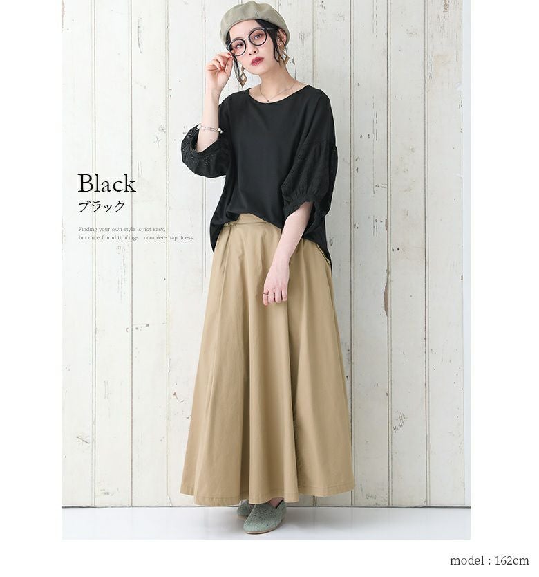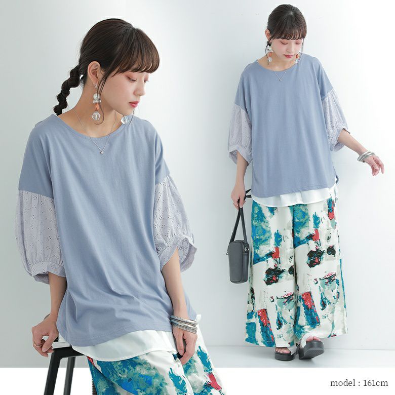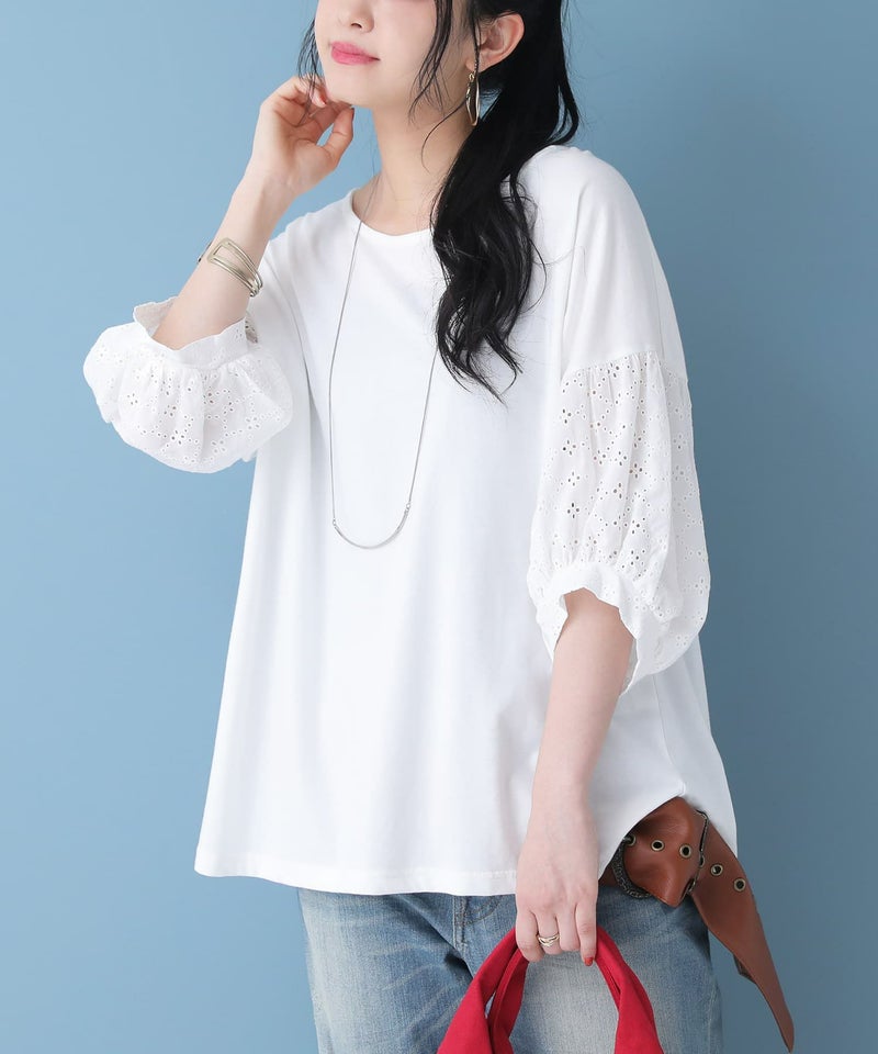 サスティナブルを意識した自然環境にも優しいオーガニックコットン100%生地を使用。袖部分の繊細な刺繍を施したコットンレース生地との組み合わせで、センス高まる一着に仕上がりました。