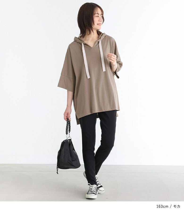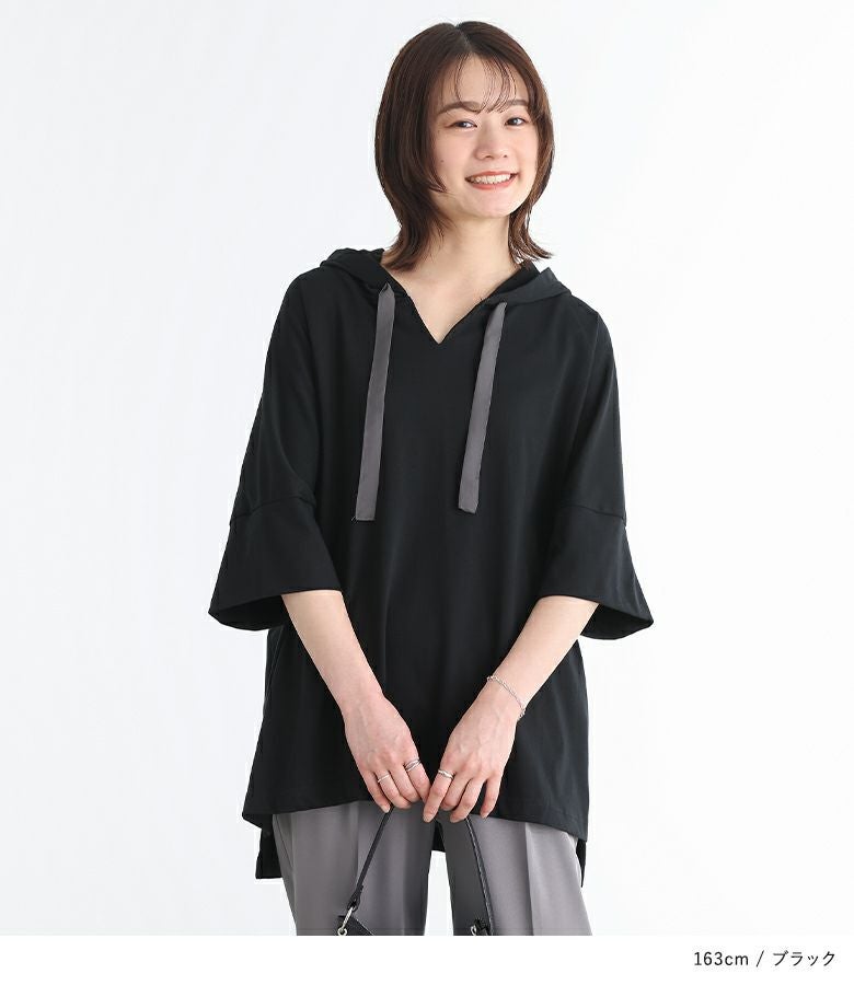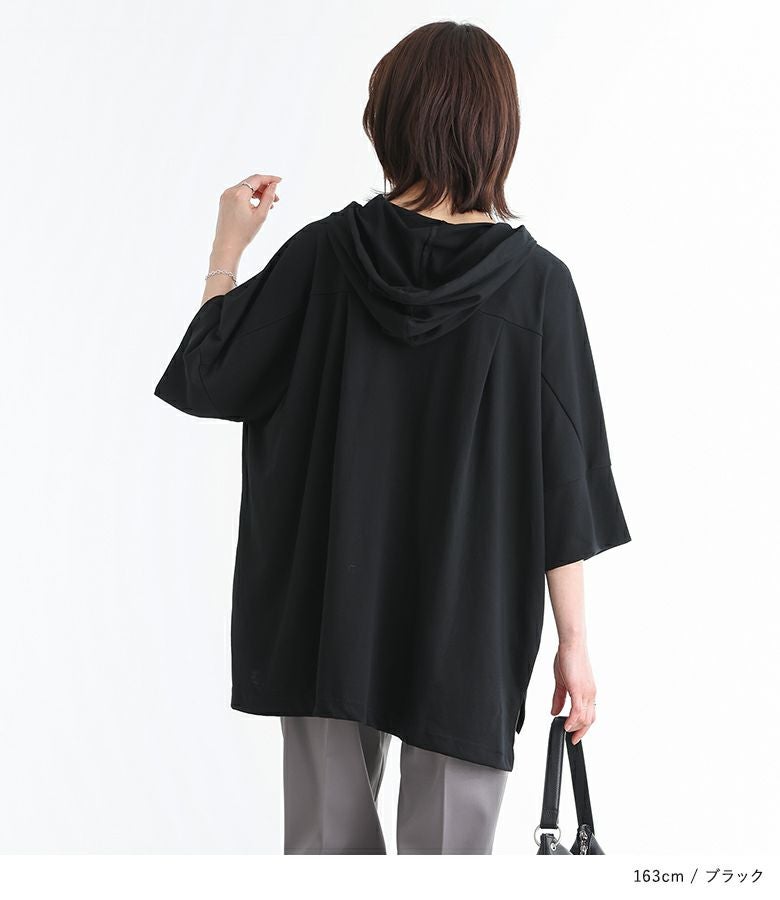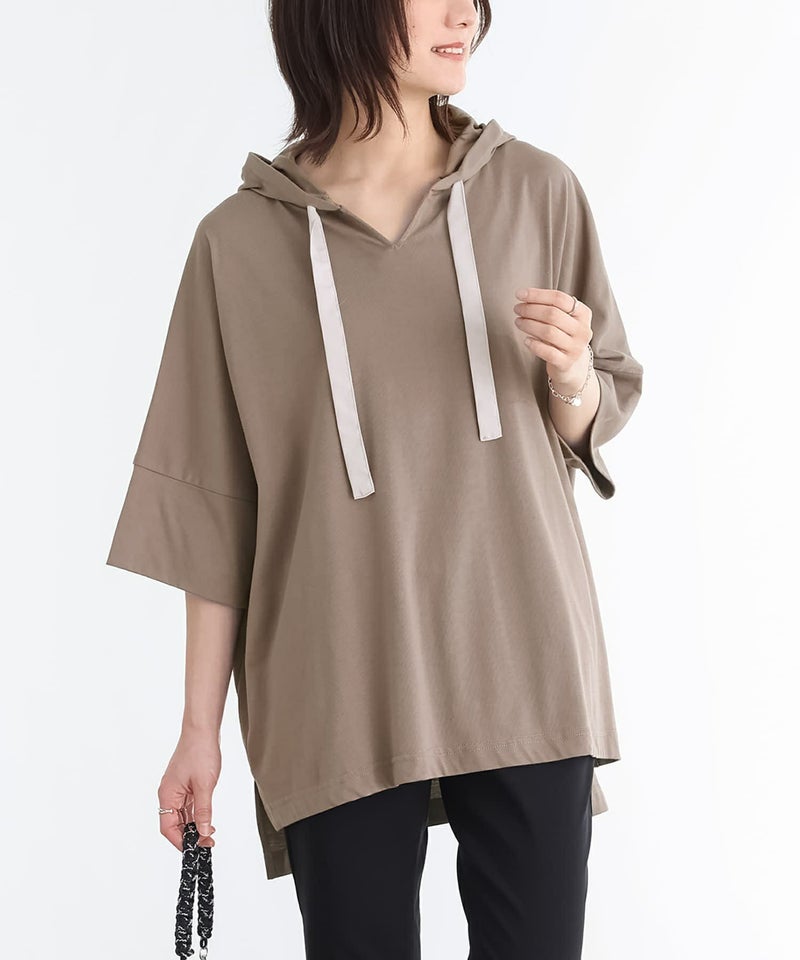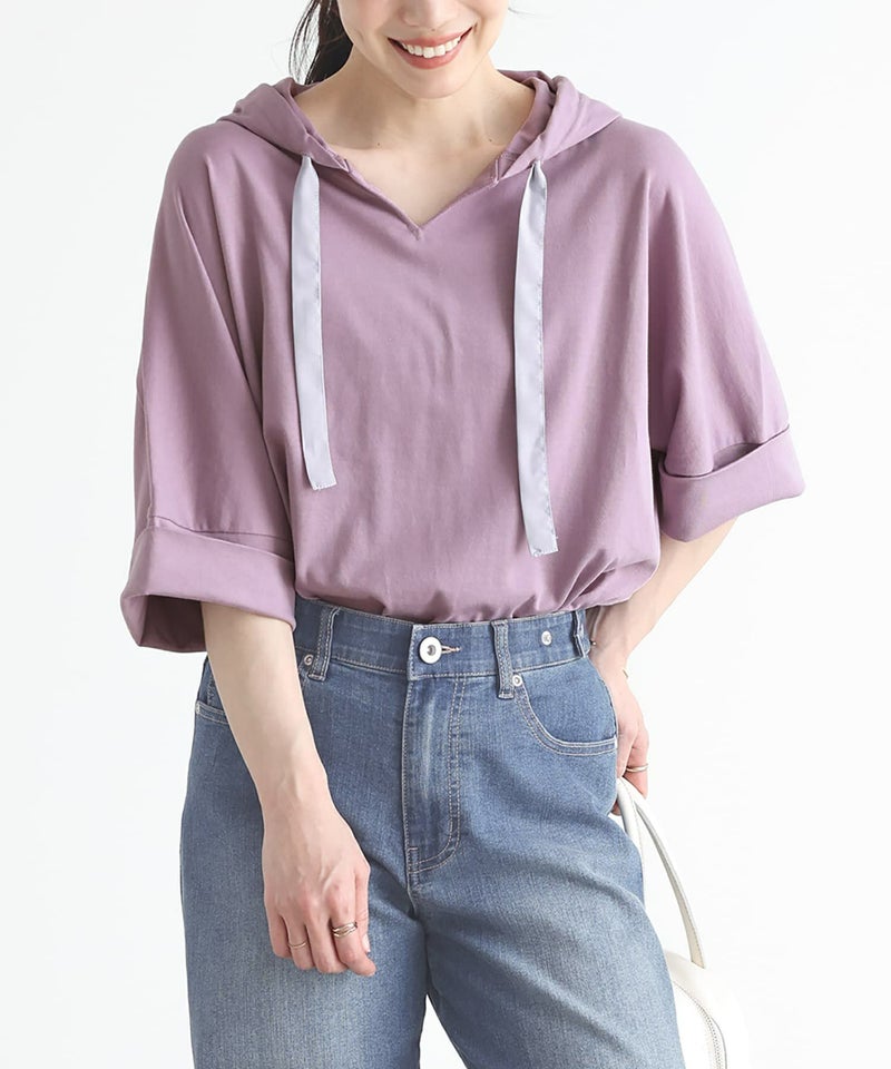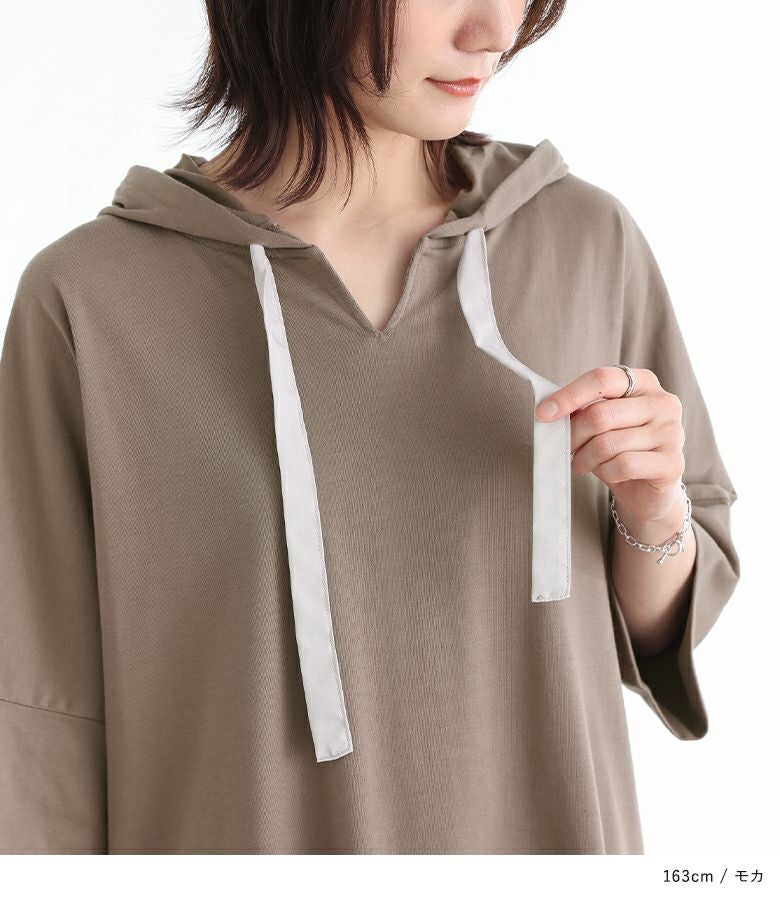 ゆるっとしたシルエットが着用するだけでこなれ感たっぷりのパーカー。涼し気なキーネックと配色のフード紐がポイントになったデザインです。ベーシックからアクセントカラーまで、色違いで揃えたくなる豊富なカラー展開も魅力的。袖はそのままでも折り返しても着用できるデザインで、折り返しても縫い代が見えない仕様になっています。前後差のある丈デザインとサイドスリットで抜け感をプラスします。