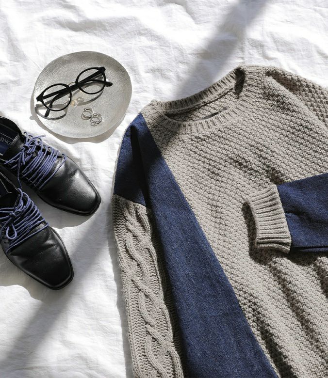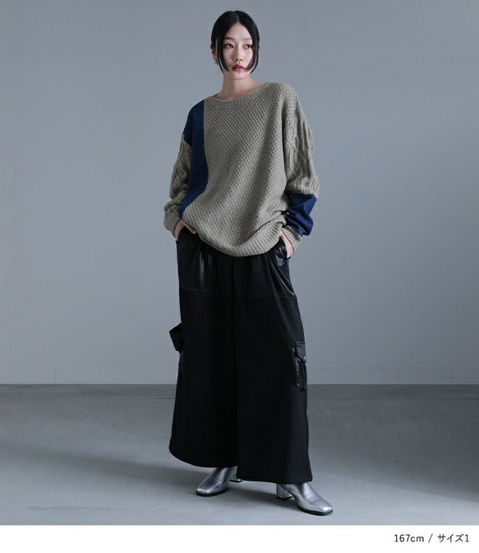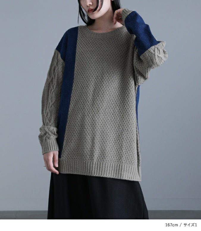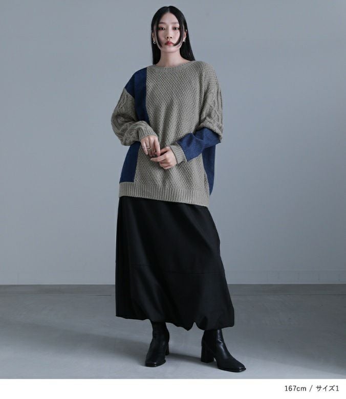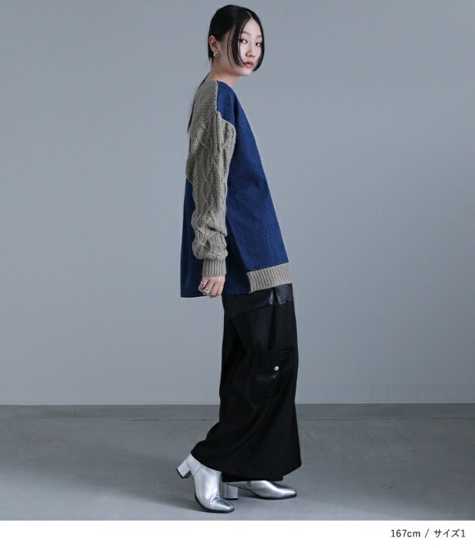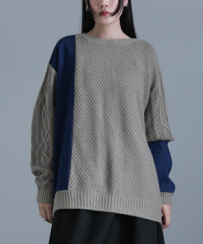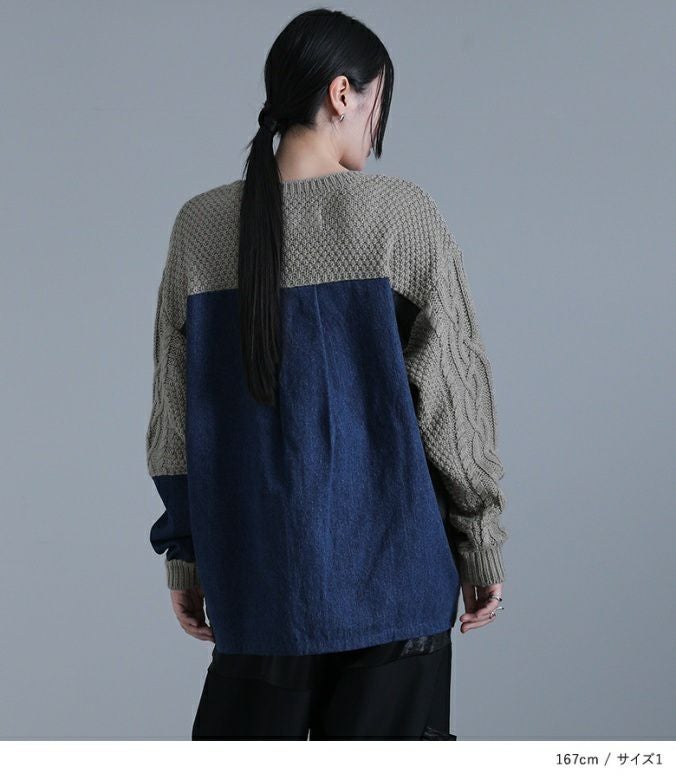 ニットとデニムをアシンメトリーに切り替えた、配色感のあるトップス。ボリュームのある袖のケーブル編みと長めの着丈で、ラフなモード感を堪能できます。ユニセックスで着られるゆるっとしたサイズ感とデザインも嬉しいポイント。