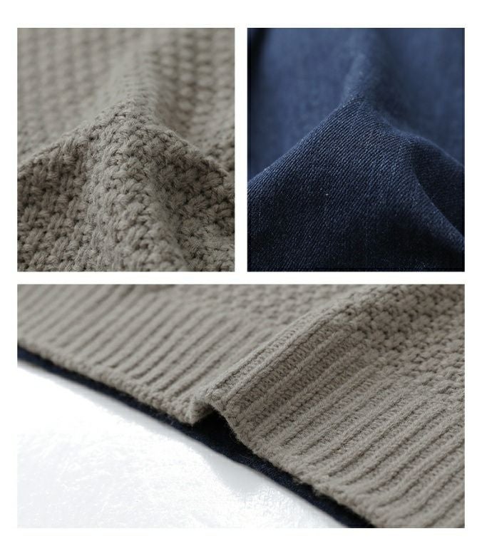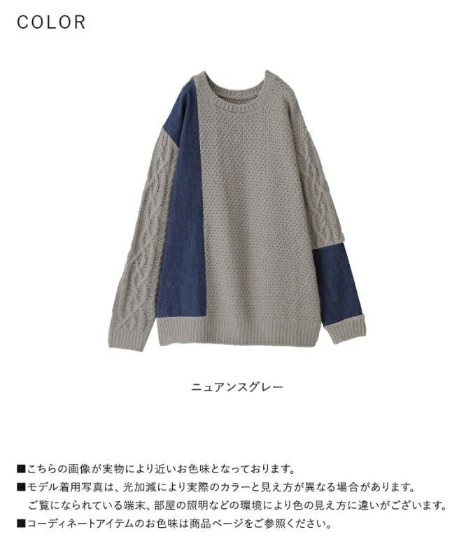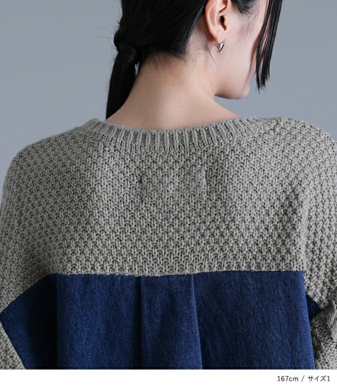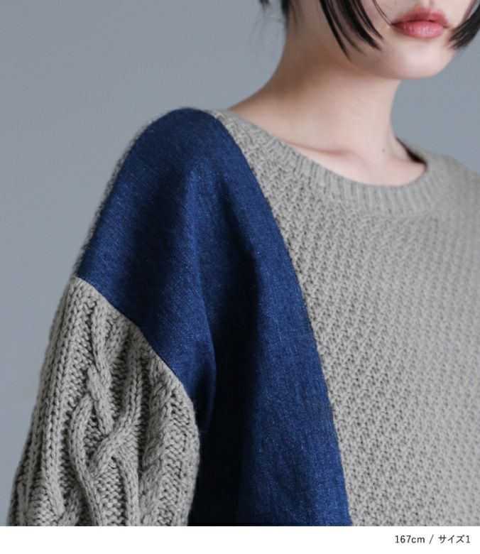 太めの糸でざっくり編まれた、柔らかな肌触りのニット。ニットの身頃は鹿の子編み、袖は幅広のケーブル編みで表情豊かな印象に。デニム部分は肌に優しく着心地の良いコットン100%素材です。