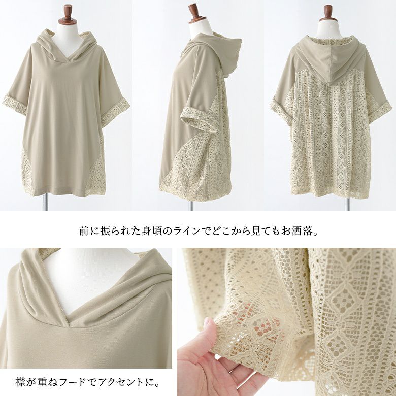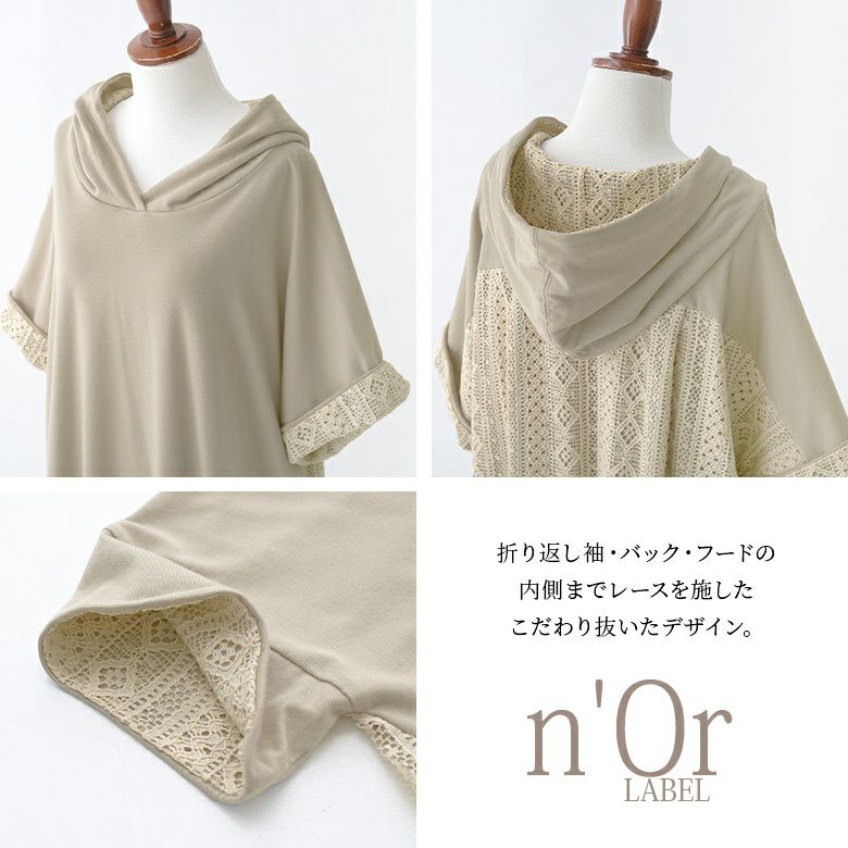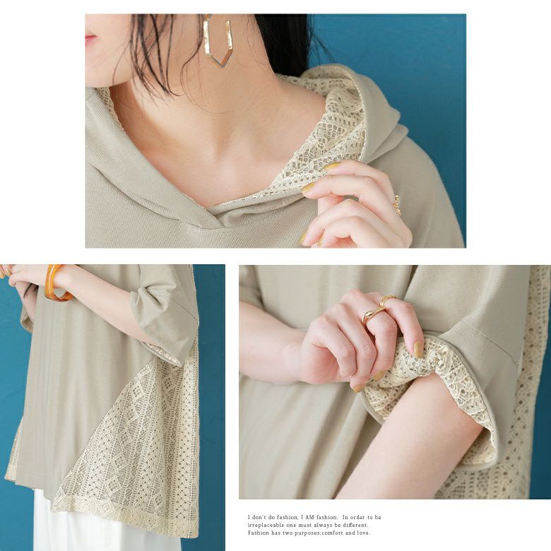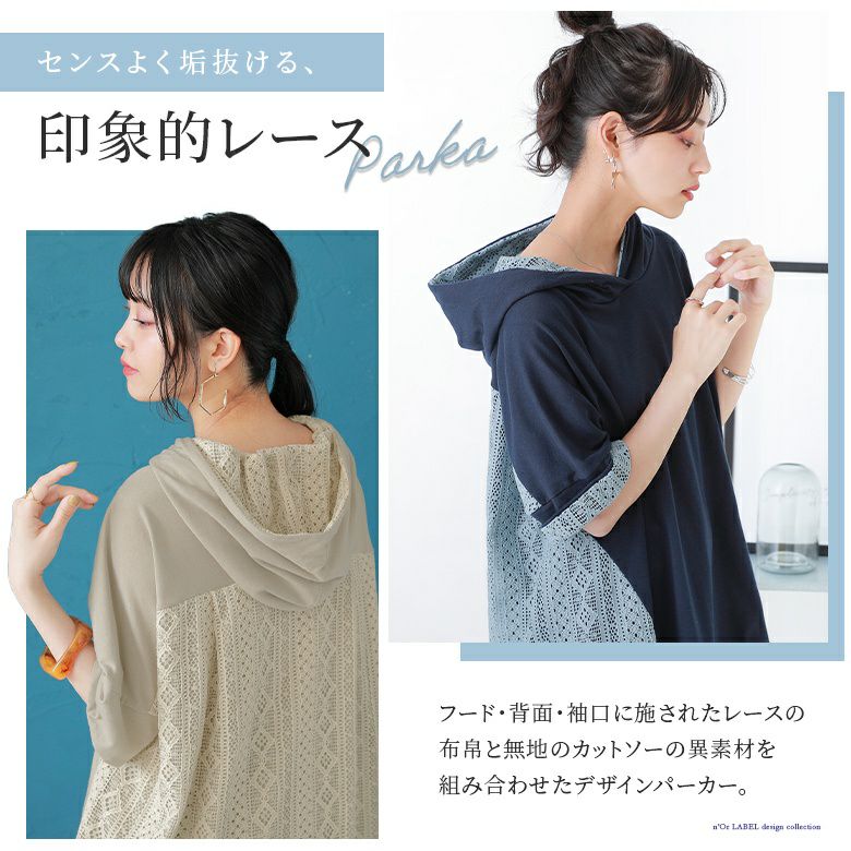 袖口・背面・フードの内側にレースを施したこだわりのデザインで、袖部分は折り返すとレースが見えて気分に合わせたアレンジが楽しめる仕様です。