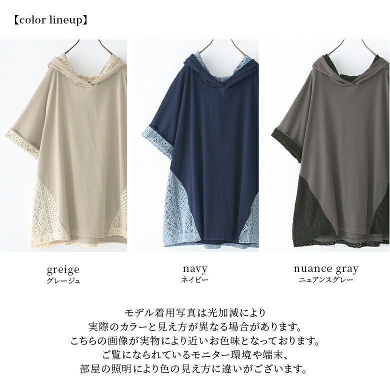 ニュアンスグレー購入。体格は156cm、53kg。色味は画像通り。レースが可愛いけど色味が落ち着いてるので、可愛い好きのアラフォーにも優しい。フードがあるけど軽いので首が締まることもない。袖は肘の位置。丈は予測では股下+4だったけど、着たらちょっと股上で、おしりもすっぽりではなかった。ゆとりがあるので体型はカバーできるけど、自分的にはモデルさんみたく下にレイヤードコーデがいいかな。真夏には暑いかもという意見もあるけど、意外と生地薄いし袖口広めで身頃がゆったりなので風通し良さそう。色味的には暑いけど、中を接触冷感系にすればいけそうな気がします。 何回か着てみての追加レビュー。動いているとフードが下がって首締まる。苦しいとかではないけど、煩わしい。昨今夏前なのに気温がヤバイので、このままの気温だと確かに真夏はきつい。春口秋口で下に長袖合わせて着る用にシフトチェンジで。