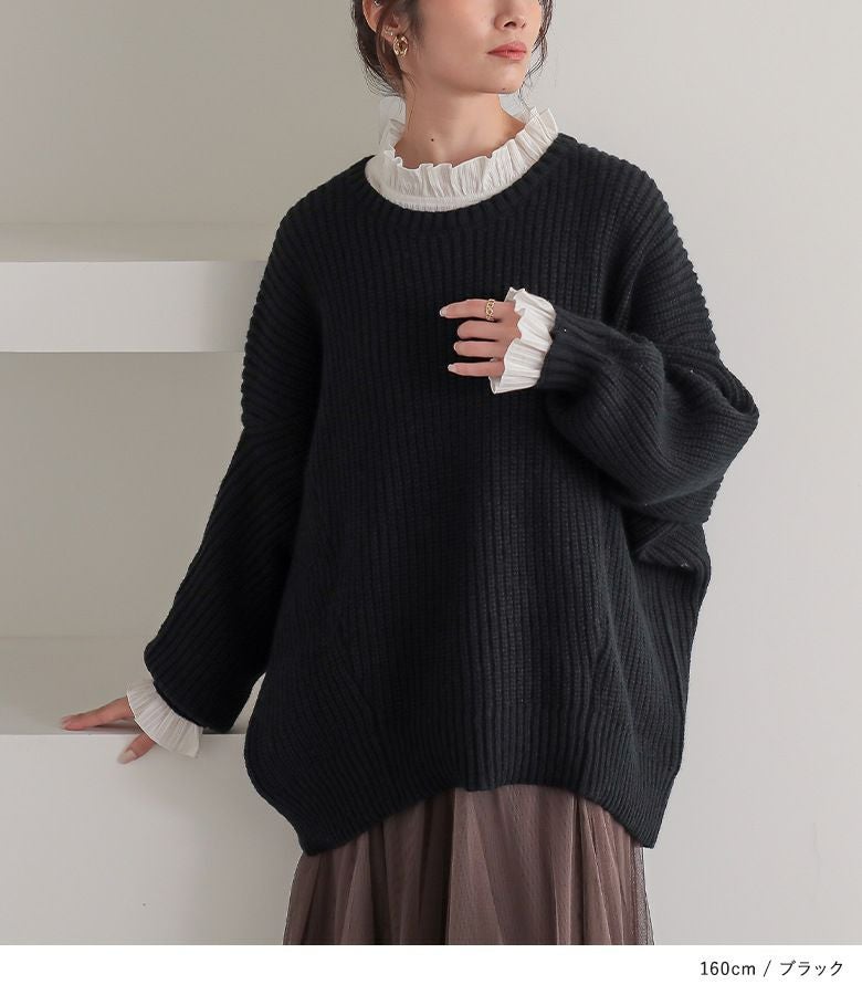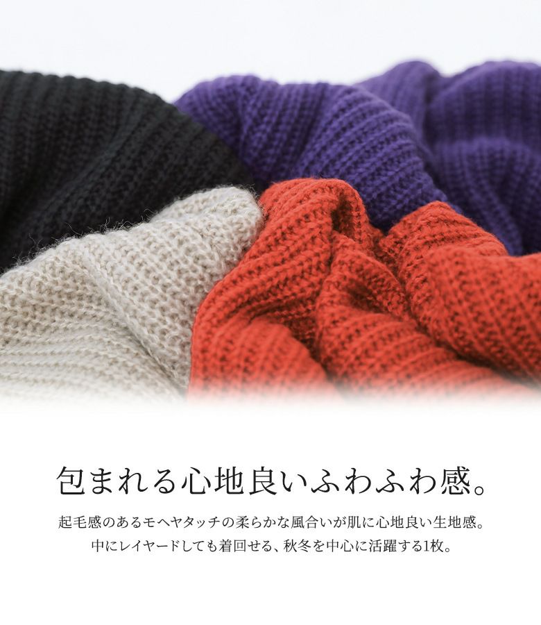 起毛感のあるモヘヤタッチの柔らかな風合いは、肌に心地良いふわふわの生地感。中にレイヤードしても着まわせて毎日のお洒落に優しく寄り添います。